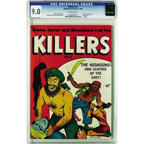 <B>Killers #2 (Magazine Enterprises, 1948) CGC VF/NM 9.0 Off-white pages.</B></I> A comic that glorifies killers and touts "crime, terror, and bloodshed" is not exactly what Mom wanted to see Junior perusing. That's probably why this title disappeared from newsstands after two issues. This second issue is hard to find -- both Overstreet and Gerber call it "scarce." The hanging (and strangling, and what looks like beheading) cover by Ogden Whitney is about as brutal as they come... compared to that, the "hashish smoking" story inside the comic doesn't sound so bad! Whitney contributed interior art as well, as did "Ghastly" Graham Ingels. Overstreet 2006 VF/NM 9.0 value = $878; NM- 9.2 value = $1,200. CGC census 4/06: 1 in 9.0, none higher.