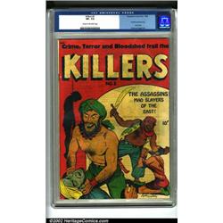 Killers #2 (Magazine Enterprises, 1948). Ogden Whitney offers another great cover full of violence in the last issue of this title, featuring early art by Graham Ingels and a controversial hashish story. CGC VF- 7.5 Cream to off-white pages. Overstreet 2001 FN 6.0 value = $253; NM 9.4 value = $800. Important notice: We expect to be auctioning lots at the rate of 200-250 per hour. Sometimes eBay Premier live bid software cannot keep up with that pace, so we strongly recommend that you place a realistic proxy bid now as insurance to avoid disappointment. Also please note that all Heritage/CAA lots purchased through eBay Premier carry a 20% Buyer's Premium.