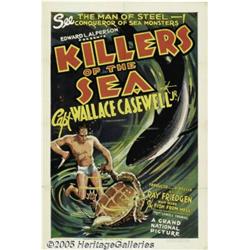 <B>Killers of the Sea (Grand National, 1937)</B></I> One Sheet (27" X 41"). This documentary focuses on the police chief of Panama City, Florida (Captain Wallace Casewell Jr.) and his quest to protect gamefish in the Gulf of Mexico. The film features several spectacular underwater scenes showing Casewell battling sea animals with knife and harpoon. Of course the real highlight of this film is this outstanding stone litho one sheet that displays Casewell doing the tango with a terrifying tortuose. There is separation at the crossfolds, slight border tears, some creases, light staining on two corners and a small paper snipe in the credits. Very Fine-.