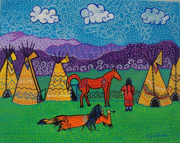 Kills Thunder painting "Happy Hunting Ground". Life is good in the Sioux village. Measures 16''w x 20'' H. Acrylic on canvas. Buyers Pay Actual Shipping and Handling Charges(see terms and conditions for more information)