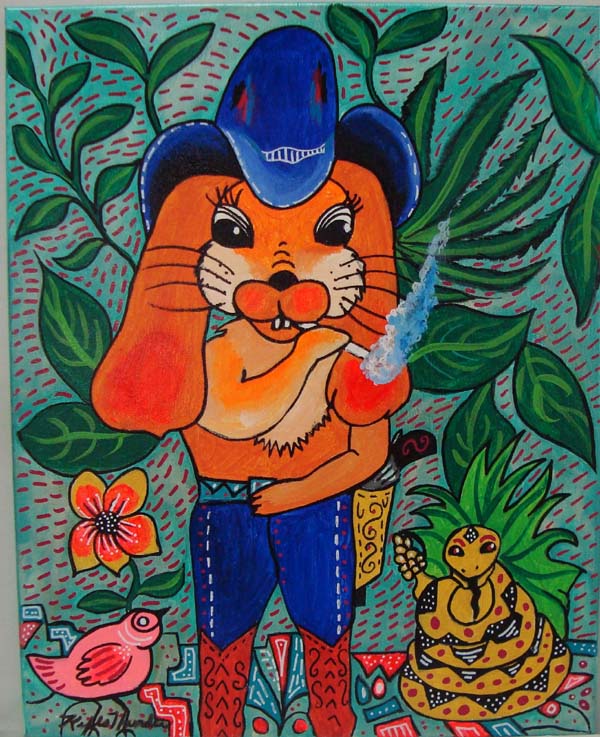 Kills Thunder Painting, "Rabbit Cowboy". Acrylic on canvas. 16''w x 20''h. Cowboy rabbit, enjoys a good smoke while his friends watch. Buyers Pay Actual Shipping and Handling Charges(see terms and conditions for more information)