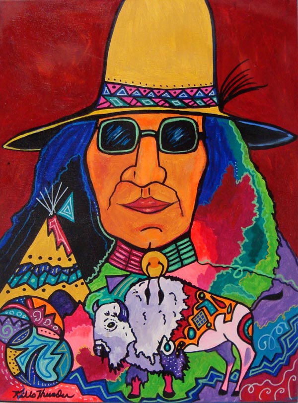 Kills Thunder painting, "Sioux Native Son". Measures 24''H X 18''W. Buyers Pay Actual Shipping and Handling Charges(see terms and conditions for more information).