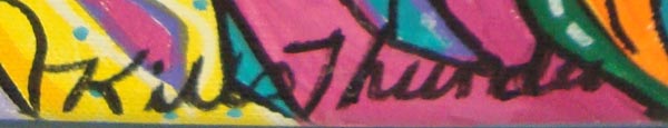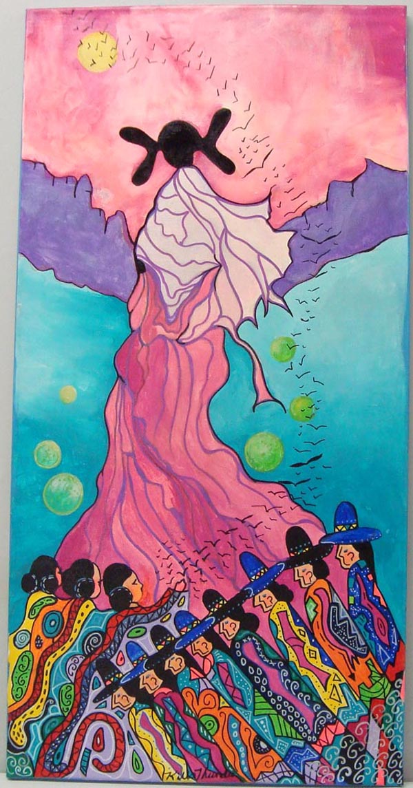 Kills Thunder painting, "Spiritual Release". 18''w x 36'' h. Acrylic on canvas. The spirit birds accompany a woman to the spirit world. Buyers Pay Actual Shipping and Handling Charges(see terms and conditions for more information)
