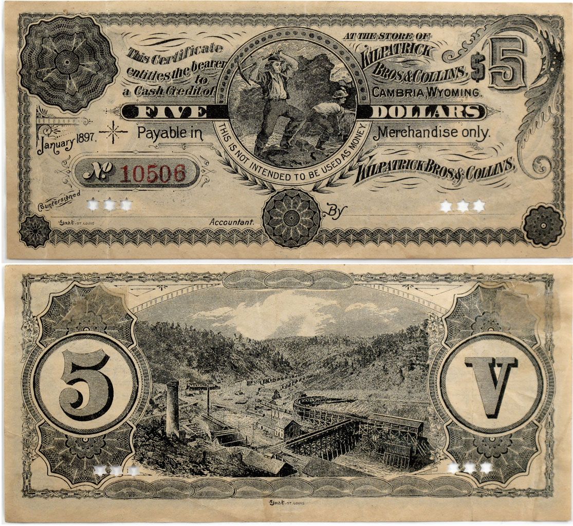 Five dollar No. 10506 Specimen Note unissued and cancelled with small star cut outs in the signature boxes. There is a vignette of a miner on center front. An impressive mining scene with counters on either side appears on the reverse. Printed on bond paper without watermark visible. Eastern banknote sized script. 172mm by 77mm. Dual sided deep blue-gray lithograph. Note is in fine condition with little discoloration and some creasing with album hinges on reverse. From the John J. Ford, Jr. Collection -61321
