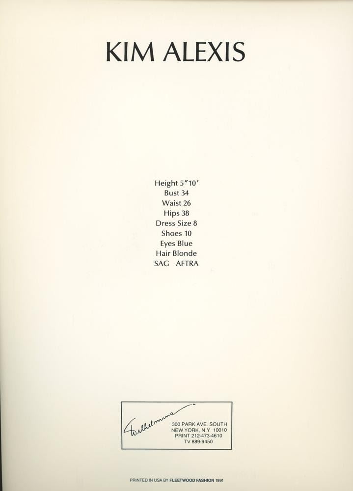 Model Kim Alexis signed Wilhelmina Modeling Agency photo with personal stats on back. 6x8 inches