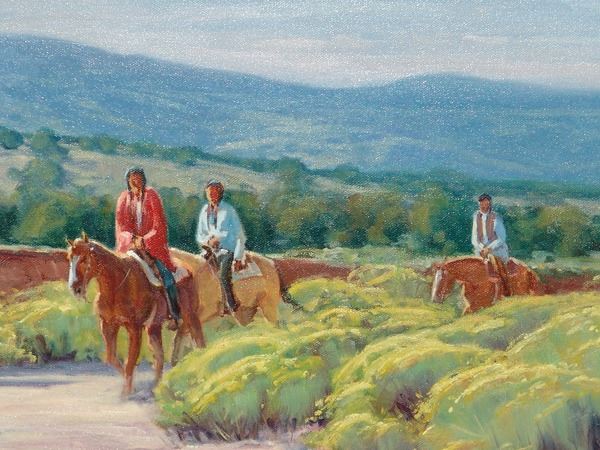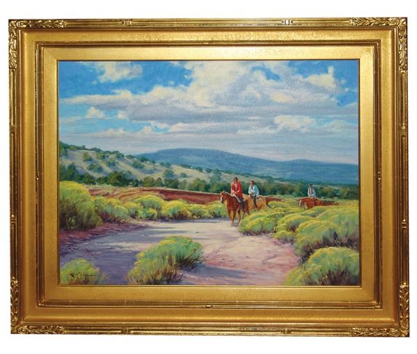 Large, signed original oil on canvas titled "September Ride." Very good condition, custom mounted and framed.Ca. 200124" x 30" (33" x 30")