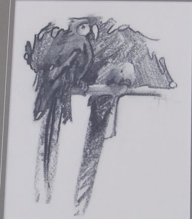 , (7180) Kim English, Charcoal, "parrots", 9 1/2" X 7 1/2", Signed Mid-right