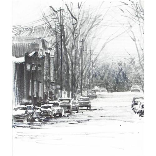 Kim English (b.1957) Ink Wash, Cars Parked Along Street, sight size 8 7/8" x 7 1/2", signed lower left