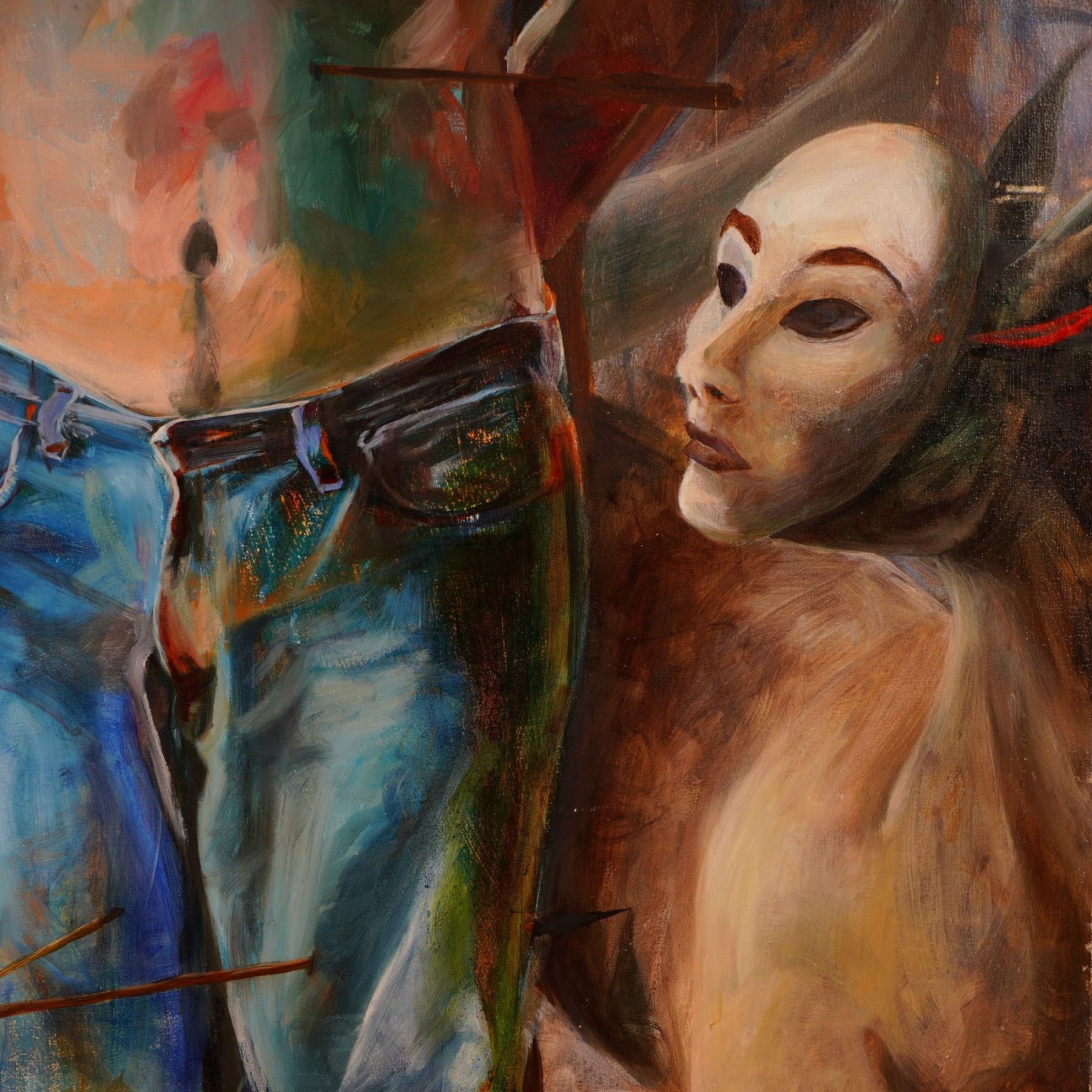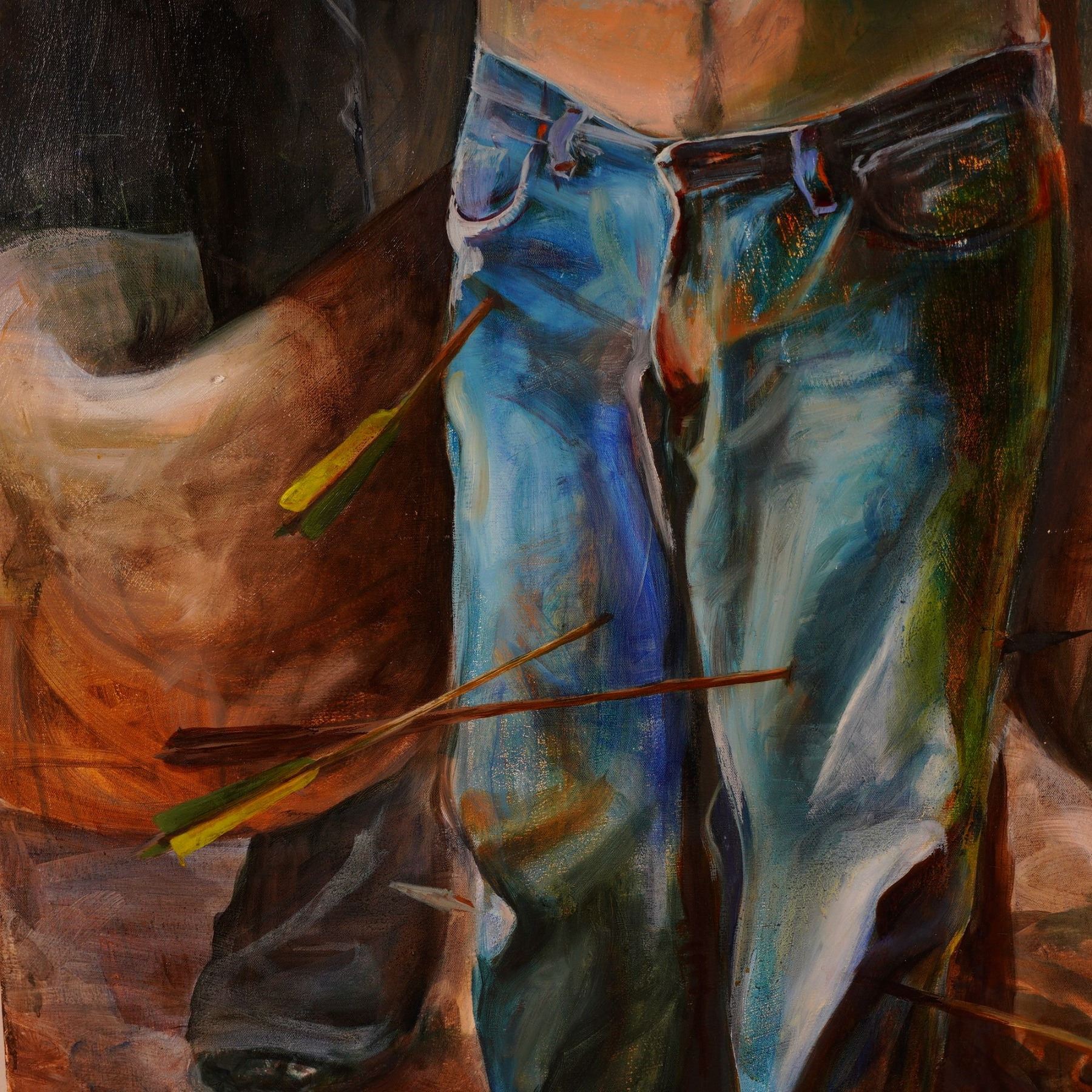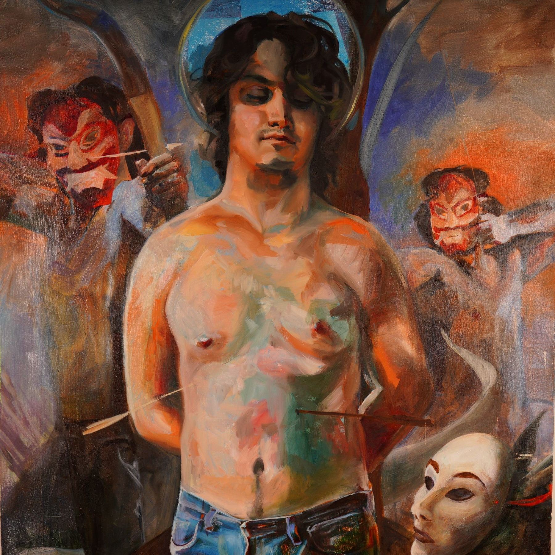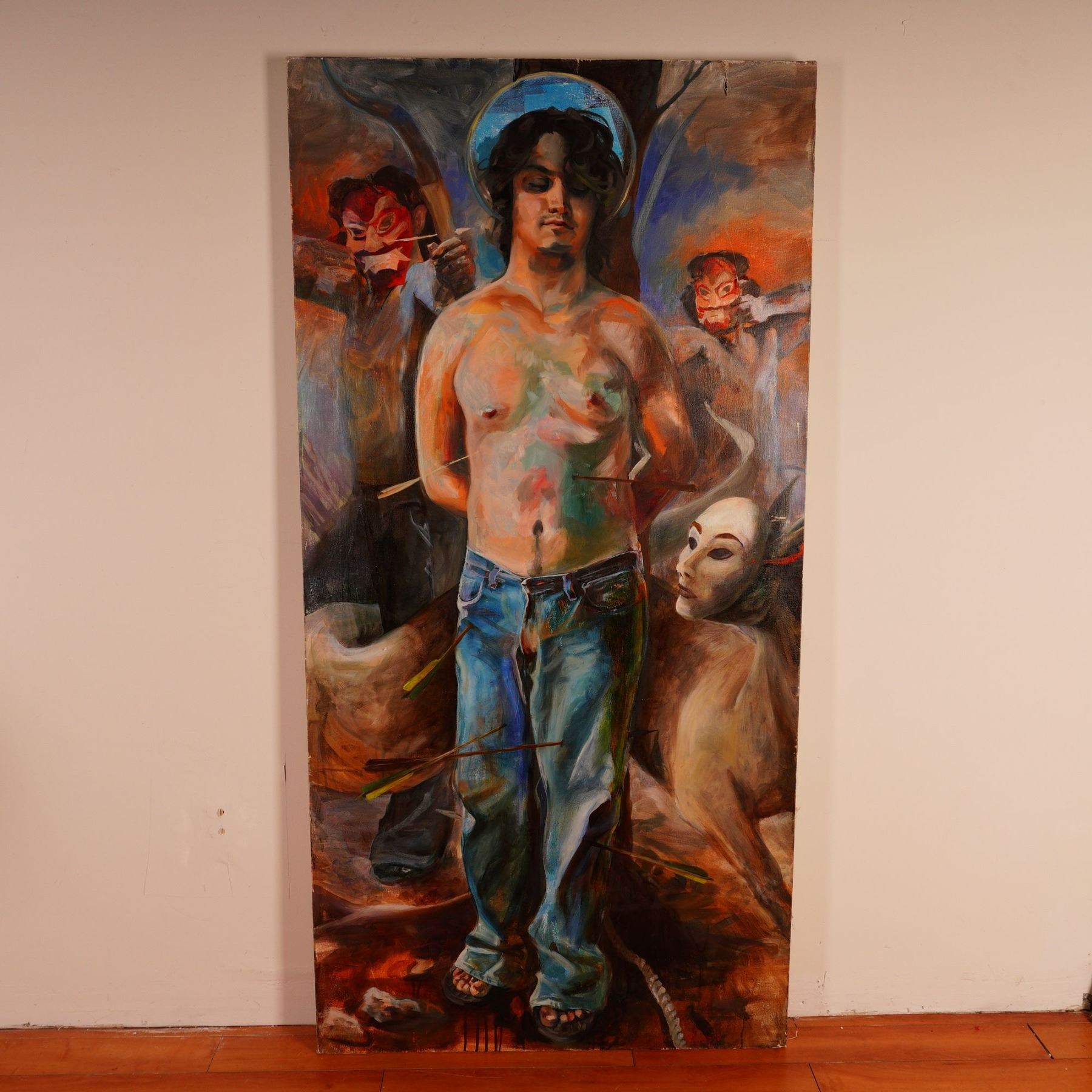 Striking contemporary oil on canvas painting by Kim Heise depicting a modern reinterpretation of Saint Sebastian. The central male figure stands bound and pierced by arrows, rendered with expressive realism and a modern twist, jeans replacing the traditional drapery. Surrounding figures in theatrical masks add a surreal and psychological depth, blending themes of martyrdom, vulnerability, and identity. The piece demonstrates bold brushwork and vibrant contrasts of blue, red, and ochre tones. A powerful statement work that merges classical iconography with modern symbolism. Signed Heise to the lower right.
