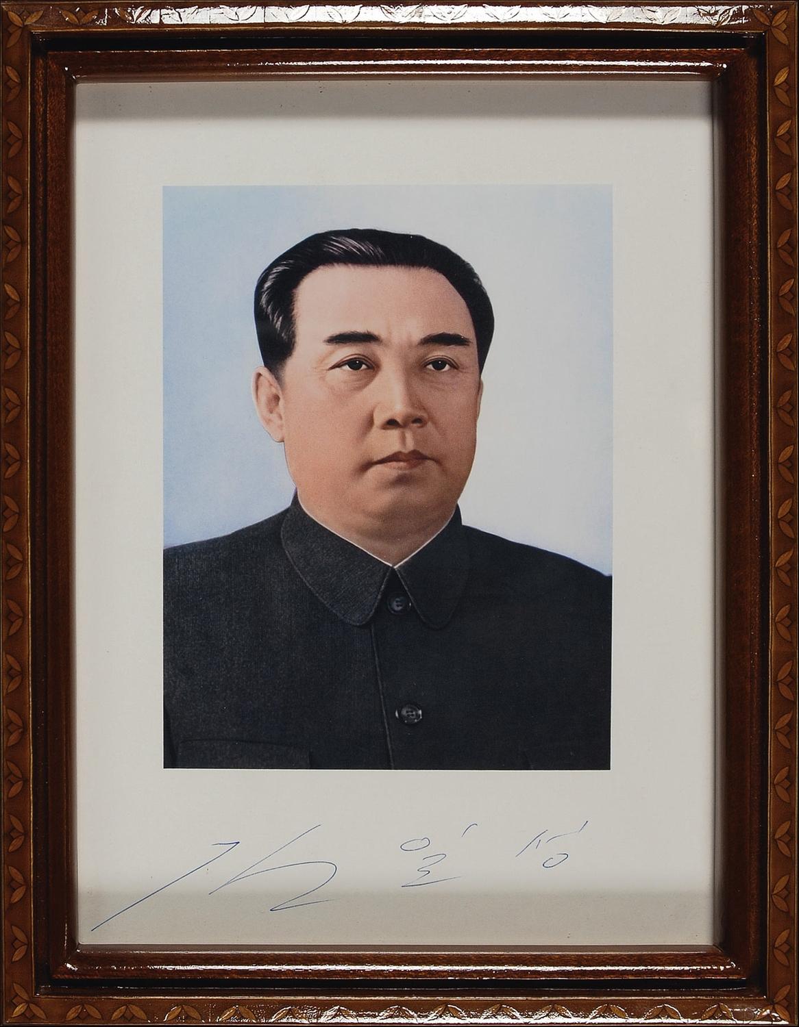 Korean communist, and later Juche, politician who led North Korea from its founding in 1948 until his death. Extremely rare color 6.5 x 9 printed photo of an artists’s portrait of, Kim Il-sung signed in the lower border, in Korean, in blue ballpoint. Photo is housed in its attractive and original decorative wood frame, to an overall size of 8 x 10.25. In very fine condition. According to the consignor this photo had been presented to the Foreign Minister of Pakistan who then “gifted it to me.” Provenance: The Barry Hoffman Collection.