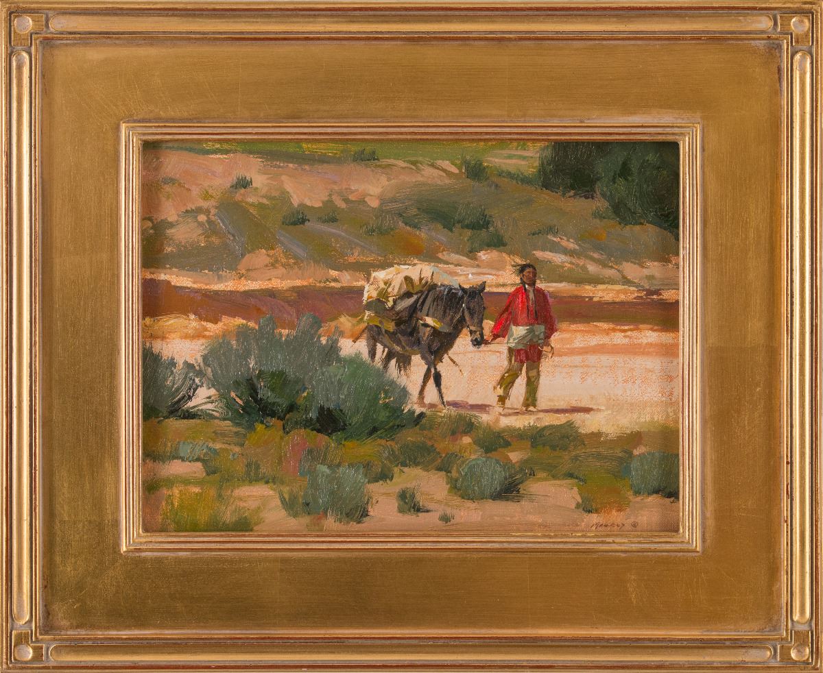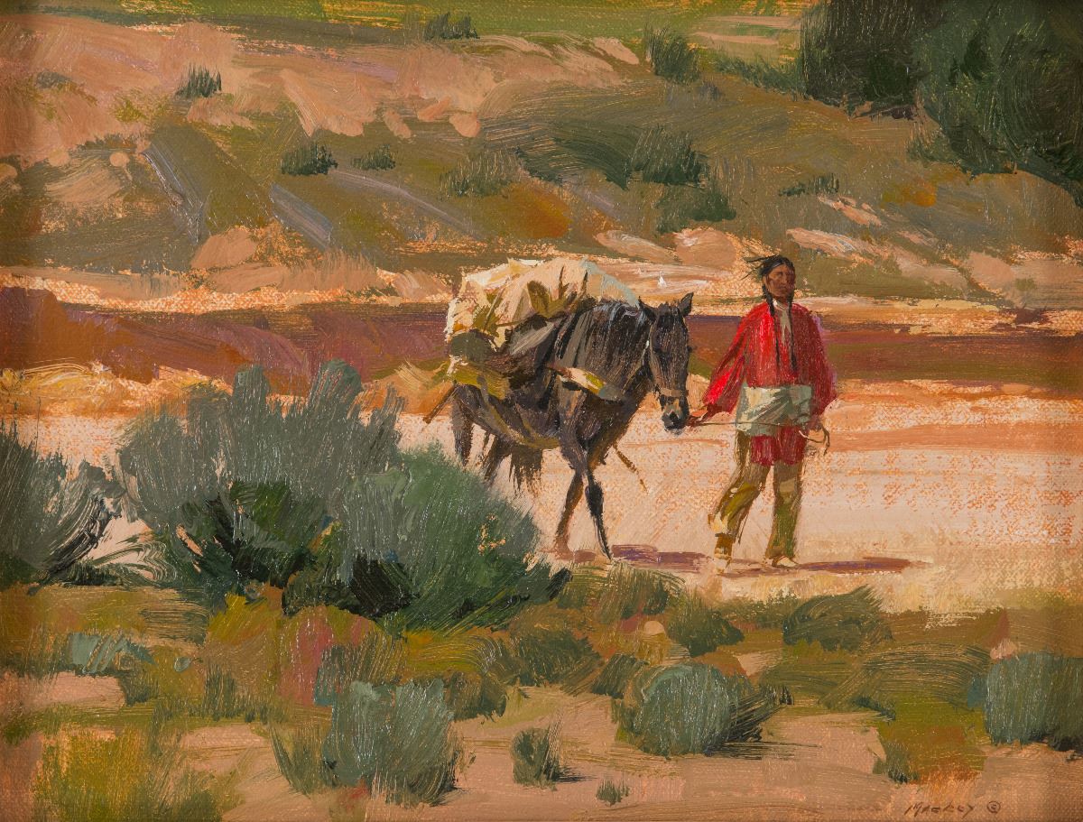 Kim Mackey (1953 - )(OPA)(AAI). Pojoaque Arroyo. 9" x 12" oil on canvasboard. Signed lower right. Verso: Titled and signed OPA.