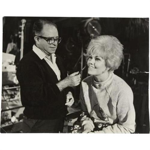 <B>Kim Novak Photo Signed to Emile LaVigne.</B></I> A b&w 11" x 14" photo of make-up artist LaVigne working with Kim Novak on the set of <I>Kiss Me, Stupid</B></I> (1964), inscribed "Dear Emile -- It's been such fun knowing and working with you! Thanks, Kim" by the actress in purple ink. In Fine to Very Fine condition with some mild wear to the edges, creased corners, and a 1.25" tear to the right edge, none of which affects the signature. <I>Accompanied by a COA from PSA/DNA.</B></I> <I>From the Emile LaVigne Estate.</B></I><BR><BR><b>Shipping:</b> Flat Material, Large (<a target="_blank" href="http://www.heritageauctions.com/common/shipping.php">view shipping information</a>)