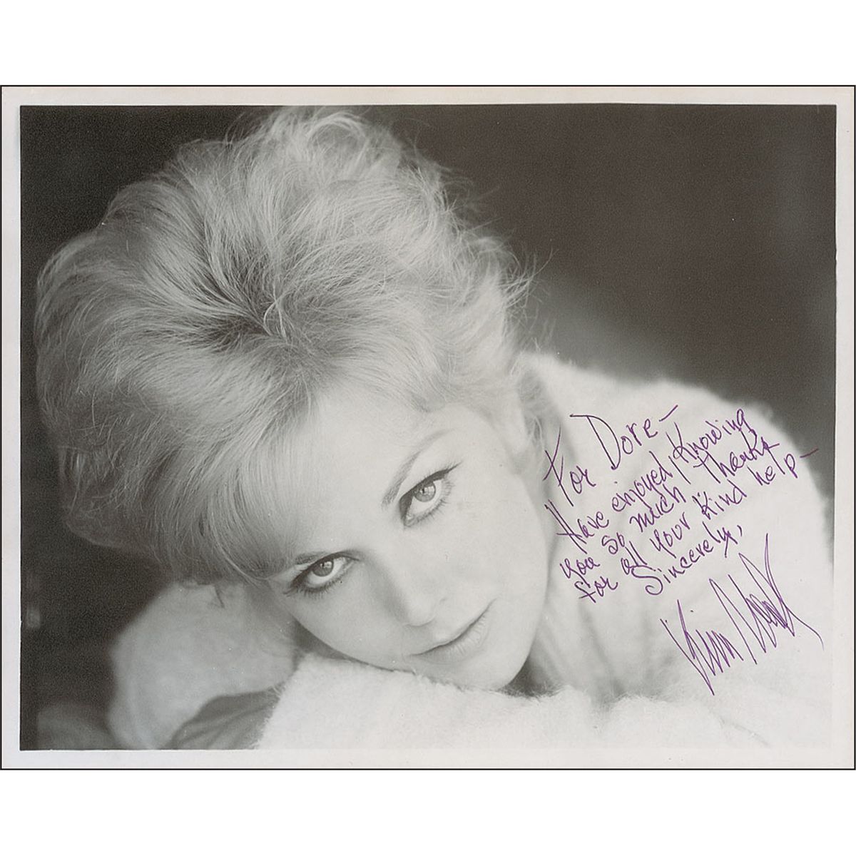 Matte-finish 8 x 10 photo, signed and inscribed in purple ink for director Dore Schary, “For Dore—Have enjoyed knowing you so much. Thanks for all your kind help—Sincerely, Kim Novak.” In fine condition.