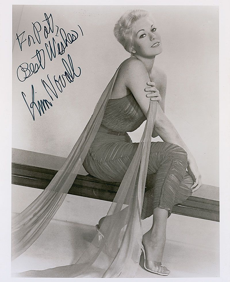 Radiant glossy 8 x 10 photo of Novak on a bench, signed and inscribed in black felt tip, “For Pat, Best wishes, Kim Novak.” In fine condition.