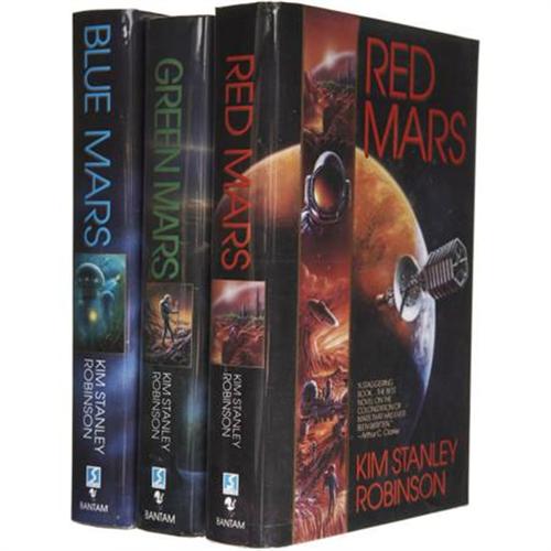 <B>Kim Stanley Robinson: Signed “Mars Trilogy” First Editions</B></I> Kim Stanley Robinson is best known for his “Mars Trilogy,” which incorporates his trademark ecological and sociological themes. Beginning in 2027, the trilogy covers 200 years of “future history” in the colonization of the “Red Planet,” which changes colors as the story progresses. All three books, in fine condition, are signed <I>“K. S. Robinson” </B></I>on the title pages. <BR><B><I>Red Mars</B></I></B></I> (New York: Bantam Books, 1993), first edition, 519 pages, black binding with black-cloth spine and red lettering, 8 vo (9.5” x 6.25”), dust jacket (in protective cover).<BR><B><I>Green Mars</B></I></B></I> (New York: Bantam Books, 1994), first edition, 535 pages, black binding with black-cloth spine and green lettering, 8 vo (9.5” x 6.25”), dust jacket (in protective cover).<BR><B><I>Blue Mars</B></I></B></I> (New York: Bantam Books, 1996), first edition, 609 pages, blue-and-black binding with gold lettering, 8 vo (9.5” x 6.25”), dust jacket (in protective cover).<BR><BR><BR><b>Shipping:</b> Books & Catalogs (<a target="_blank" href="http://www.heritageauctions.com/common/shipping.php">view shipping information</a>)
