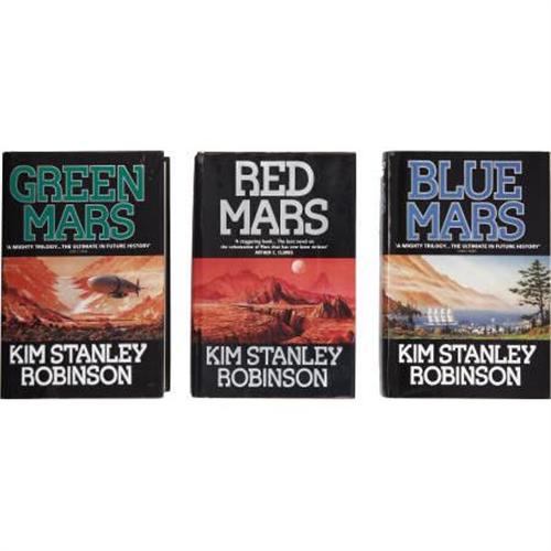 <B>Kim Stanley Robinson</B></I>. <B>Mars Trilogy First UK Editions</B></I>, including: <B><I>Red Mars</B></I></B></I>; <B><I>Green Mars</B></I></B></I>; <B><I>Blue Mars</B></I></B></I>. London: Harper Collins, 1992-1996. <BR>First UK hardcover editions. Three octavo volumes.<BR><BR>Red binding with silver spine titles, black binding with gilt spine titles, and blue binding with silver spine titles, respectively. Dust jackets. Overall fine with minor wear. <I>From the Robert and Diane Yaspan Collection.</B></I><BR><BR><b>Shipping:</b> Books & Catalogs (<a target="_blank" href="http://www.heritageauctions.com/common/shipping.php">view shipping information</a>)