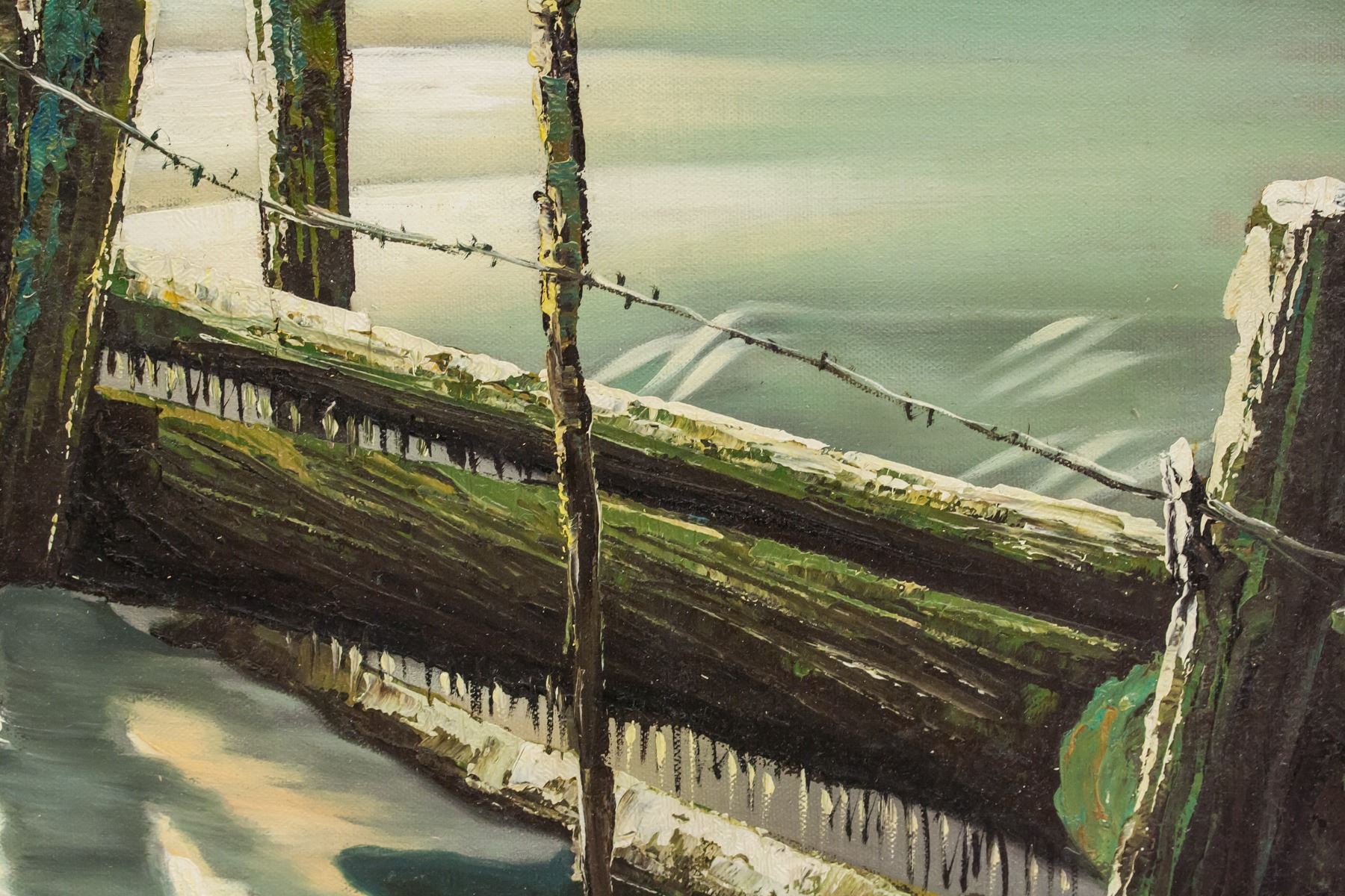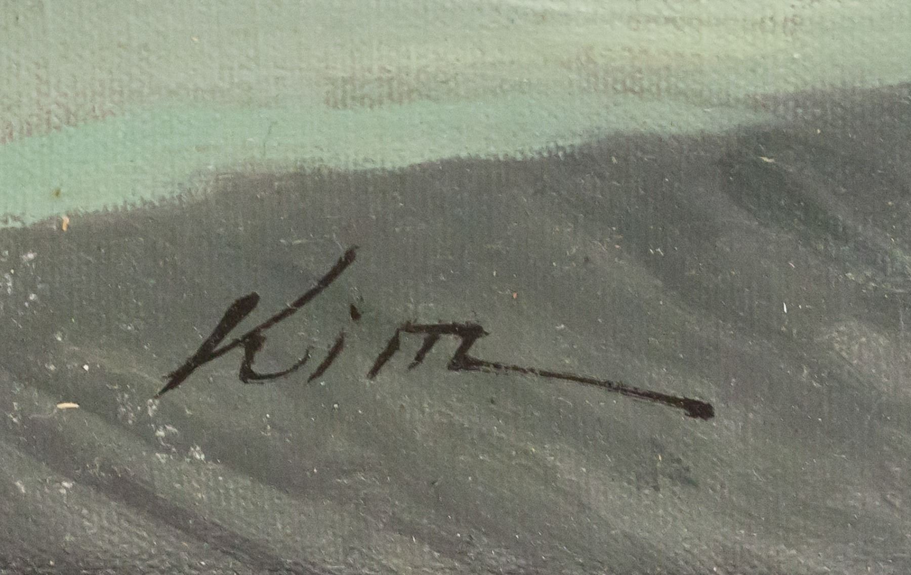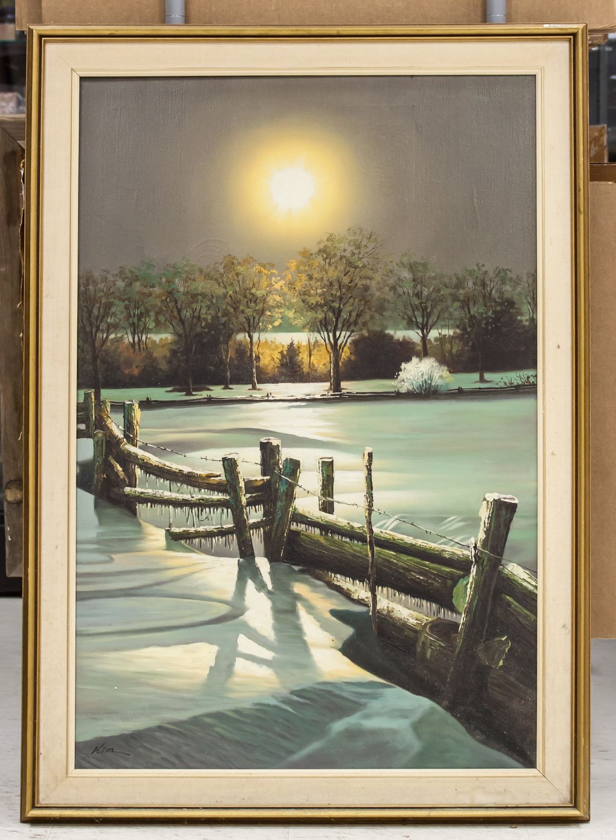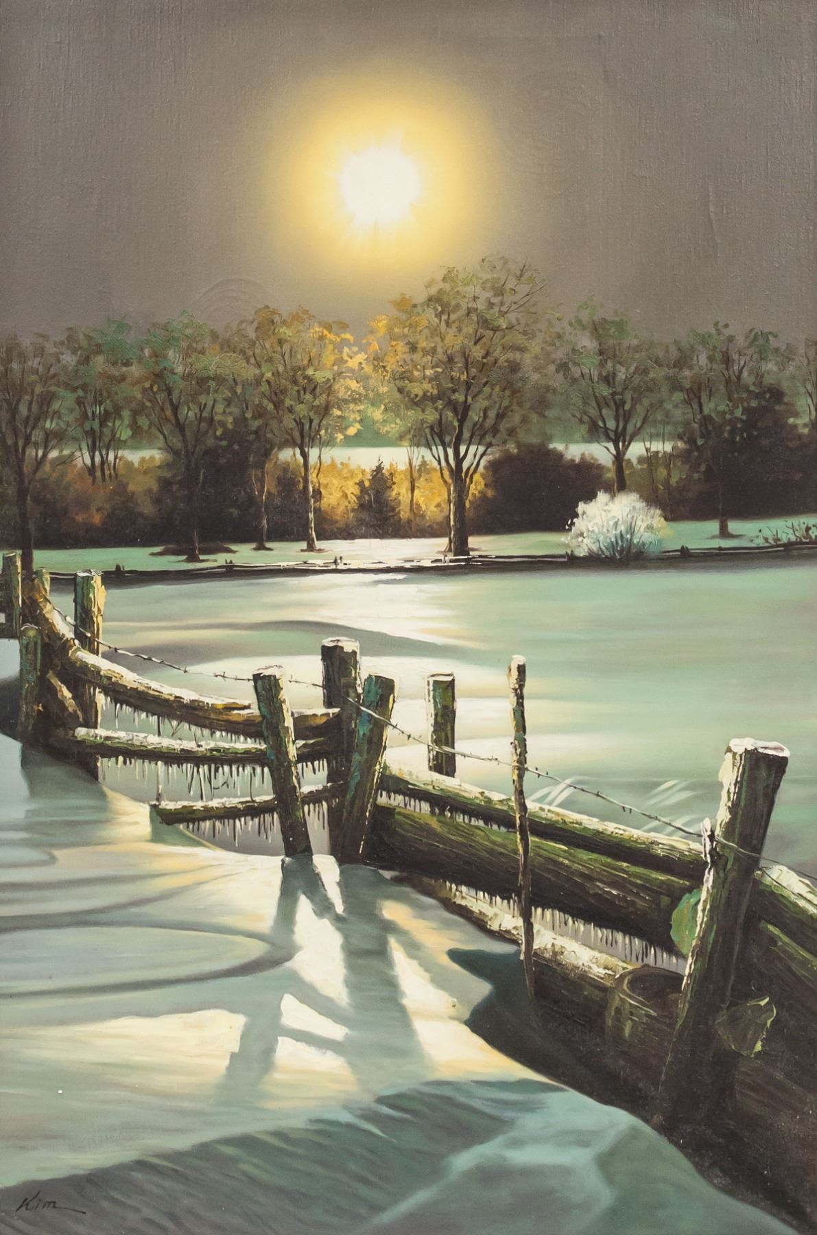 Oil on canvas, framed. Featuring landscape scene with moonlight reflecting off the snow. Signed by Kim Suk Hwan (Korean-Canadian, 20th Century) in the bottom left corner. 90 x 60 cm (35.5 x 24 in), Frame: 104 x 73 cm (40.5 x 29 in). Provenance: Acquired from the artist, circa 1980s