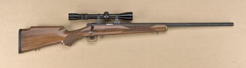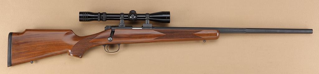 Kimber 22HS model bolt-action sporting rifle with fluted 24” barrel, checkered wood stock, mounted with 3x9 Redfield scope on high-rise Kimber mounts in original factory dovetails. The rifle shows studs for QD sling swivelswhich are not present. The gun is in fine to near excellent used condtion and shows a factory hard-rubber pad. The action is good, the bore is excellent. Shows just minor use. Serial #KAO7779. Est: $600 - $1,200