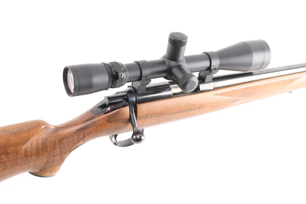 Kimber of Oregon Model 82 Custom Classic .25-20. Single-shot bolt action. This is 1 of 250 that were manufactured in .25-20 WCF caliber. These rifles were manufactured before 1988 when this model was discontinued. It does not have provisions for sights and the top of the receiver has integral scope mounts. Mounted on a nicely figured multi-point checkered Claro AA grade walnut stock with contrasting ebony forend tip, steel grip cap, sling studs and checkered steel Niedner buttplate. Mounted with a Leupold Vari-X III 3.5x10 Tactical scope, clear optics. Bore is excellent/bright, wood and blue finish are excellent.