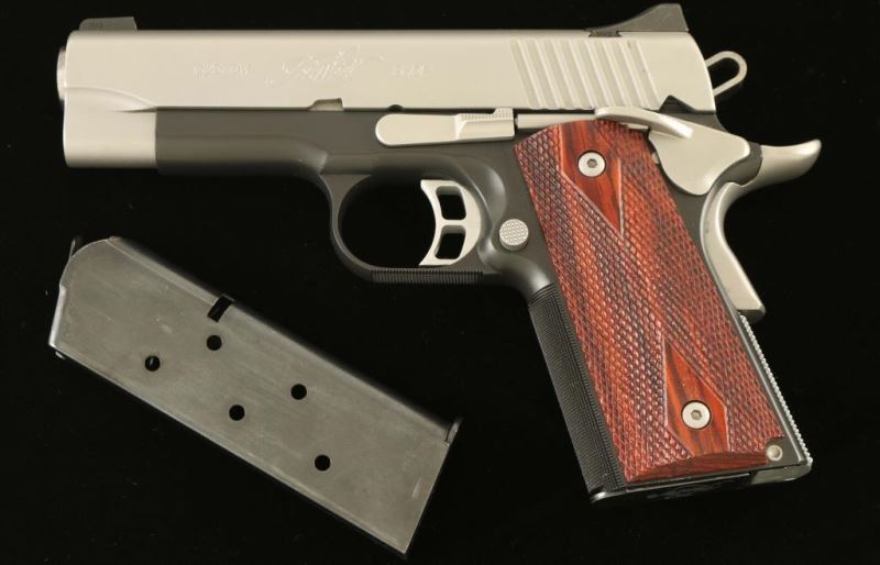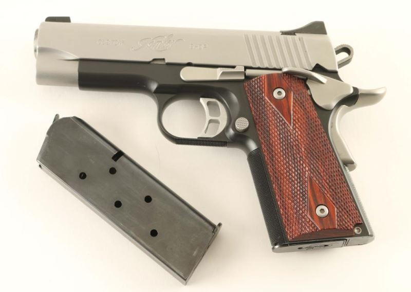 'Custom Defense Package' Premium quality 1911-A1 style single action semi-automatic compact pistol chambered in .45 Auto. Features a satin finished stainless steel slide w/ carry melt treatment, match grade 4" bushingless carbon steel barrel, full-length steel guide rod, dovetailed three-dot night sights, adjustable match grade serrated aluminum trigger, skeletonized hammer, ambidextrous thumb safety, beavertail grip safety, matte black KimPro II finished aluminum frame with finely knurled triggerguard & front strap, push button magazine release, factory 7 round magazine, and double diamond checkered rosewood grips. Includes the original factory hard case with documents, lock, and spare magazine. Pistol exhibits little to no visible wear. Action is smooth, bore is pristine and grips are fine. Likely unfired. Condition is NRA like new in case. ***Modern Firearm***