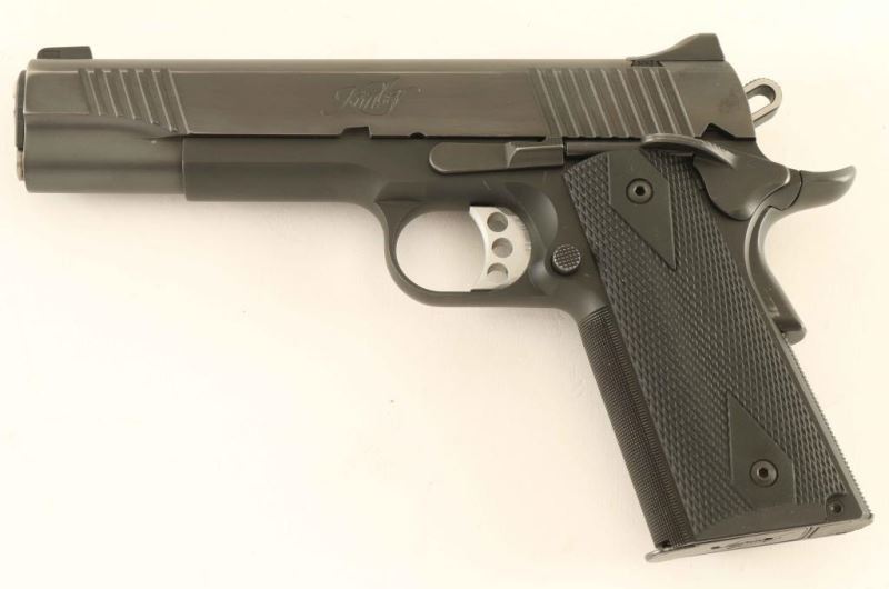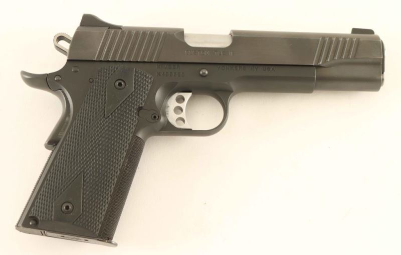 Premium quality 1911A1 pattern single action semi-automatic pistol chambered in .45 Auto. Features a matte black finish, 5" match grade barrel, full-length steel guide rod, dovetailed low-profile three-dot night sights, serrated match grade aluminum trigger, skeletonized hammer with serrated spur, front & rear slide serrations, manual safety on the left side of the frame, extended beavertail grip safety, push button magazine release, factory 7 round magazine, knurled flat mainspring housing, 30 lines per inch knurling on the front strap, beveled magazine well and two-piece double diamond checkered black rubber grips. Includes the original factory hard case with documents, lock, flag and takedown tool. Pistol exhibits approximately 95% of it's original finish showing light holster wear and a small amount of emerging surface rust on the rear of the slide. Action is smooth, bore is pristine and the rubber grips are fine. Condition is NRA Very Good. ***Modern Firearm***
