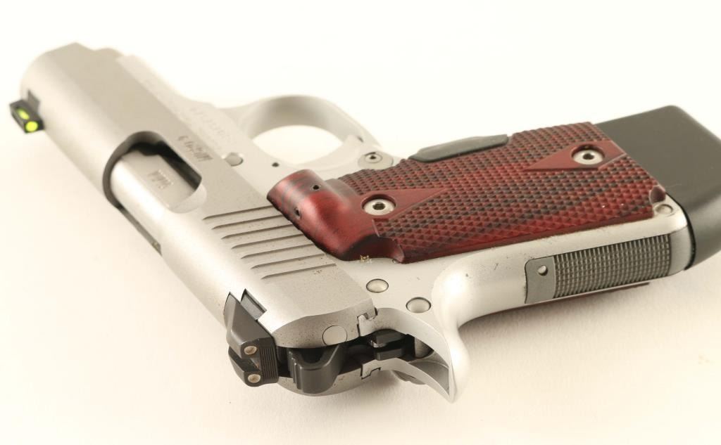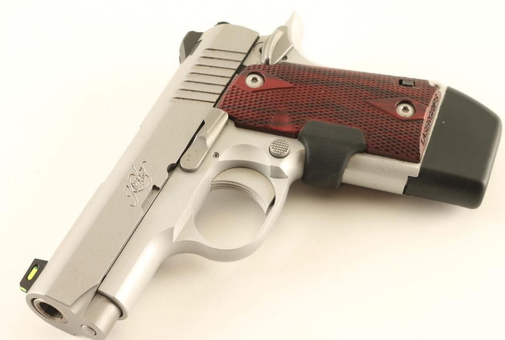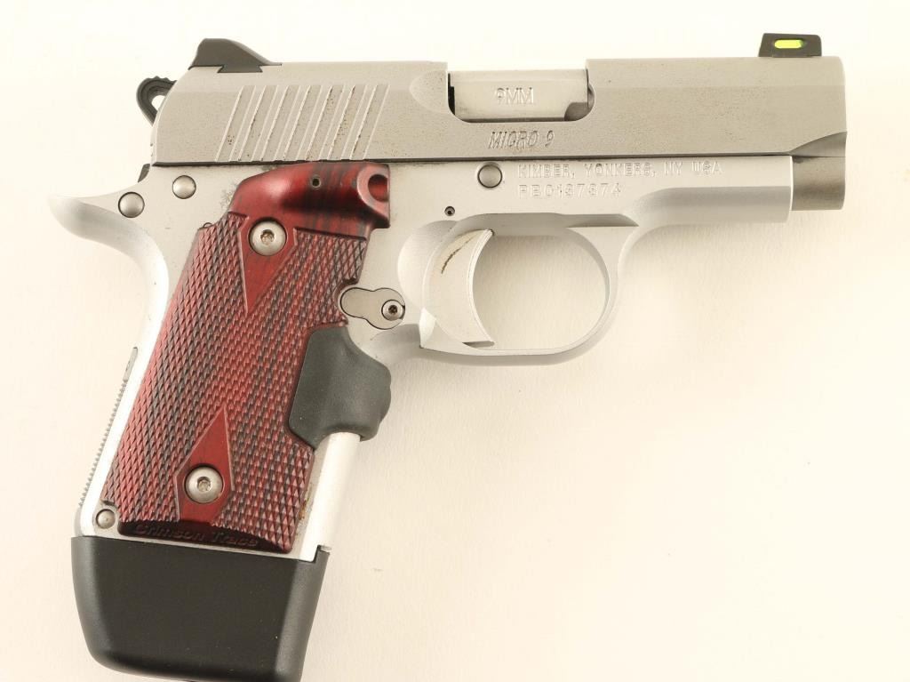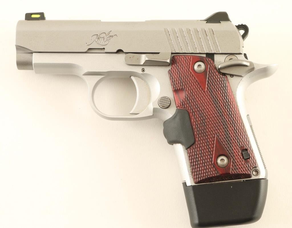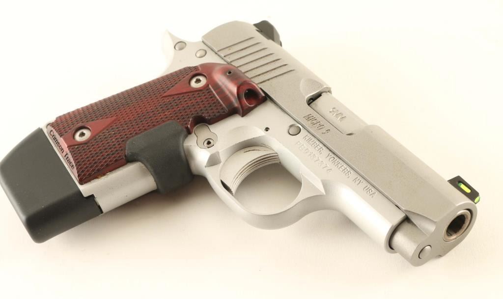 1911A1 style single action semi-automatic sub-compact pistol chambered in 9mm. Features a satin finished stainless steel slide, 3.15” barrel, full-length steel guide rod, dovetailed green fiber-optic front sight, dovetailed two-dot rear sight with square notch, serrated match grade trigger, skeletonized hammer with serrated spur, manual safety on the left side of the frame, push button magazine release, factory 8 round magazine, aluminum frame, knurled flat mainspring housing and Crimson Trace double diamond checkered faux rosewood Lasergrips with integrated laser sight & pressure switch. Pistol exhibits some scattered surface rust on the ferrous metal and some small losses on the frame. Action is smooth, the bore is excellent, and the laser is in good working order with fine grips. Condition is NRA Good. ***Modern Firearm***