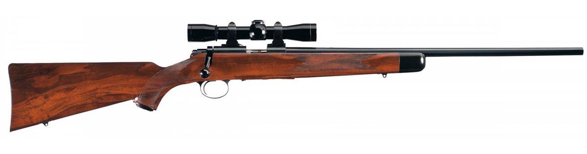 Manufactured without sights, there is a Leupold M8-4x Compact scope mounted with quick detachable scope rings. The barrel has the Oregon address. Mounted on a nicely figured, multi-point checkered walnut pistol grip stock with contrasting forend tip, sling swivels, steel grip cap and checkered steel buttplate.