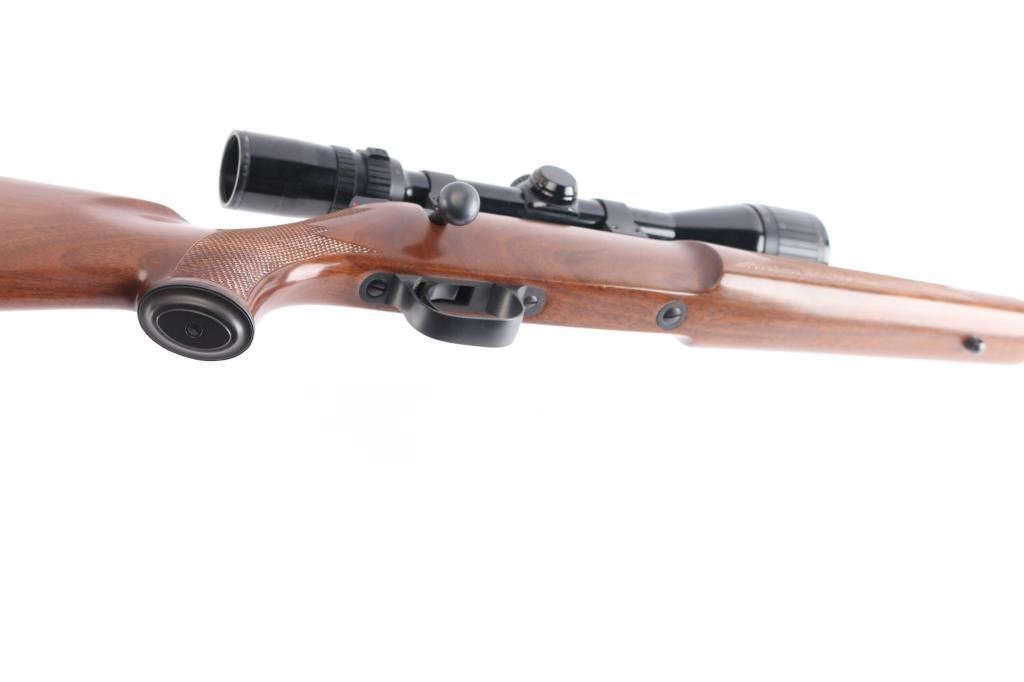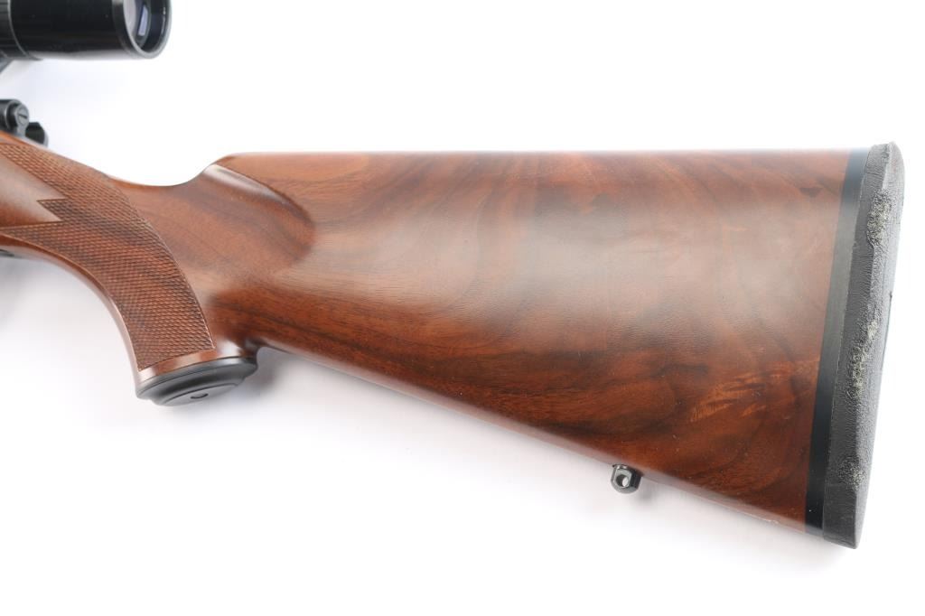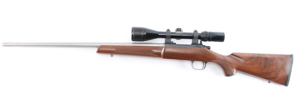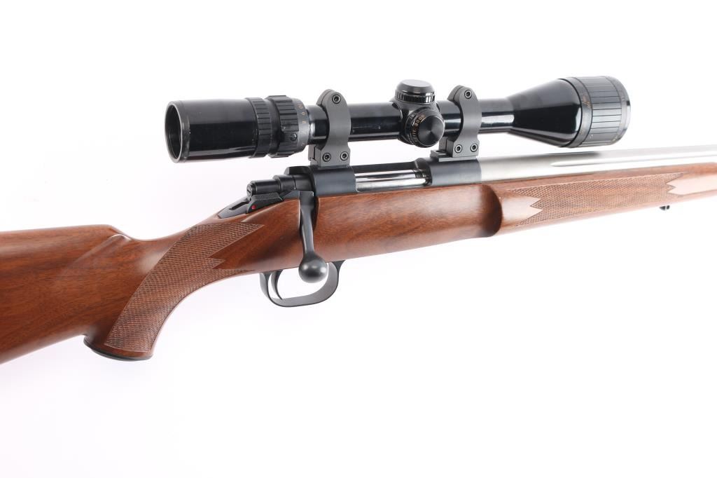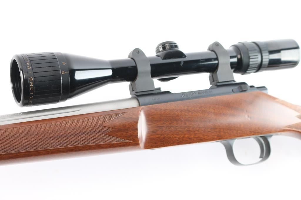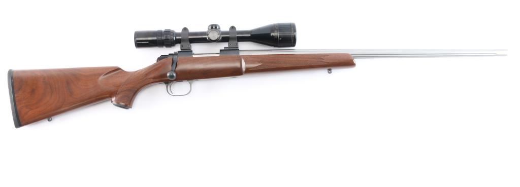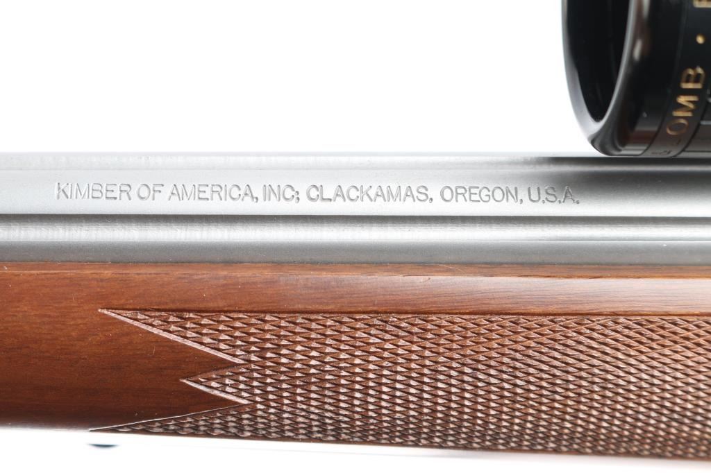 American made single shot bolt action rifle chambered for .223 Remington manufactured by Kimber of America, Inc. out of Clackamas, OR. Featuring an approximately 24 inch stainless fluted tapered barrel with a recessed crown, no iron sight provisions, turned down bolt handle, manual safety, receiver drilled and tapped for optic mounts, smooth curved trigger, polished bolt body, and bolt release on left side of the receiver rail. The furniture is figured walnut semi-pistol grip buttstock with checkering at the wrist, checkering at the beavertail forend, black grip cap, satin finish, sling swivel studs in the buttstock and forend, and black rubber recoil pad. The bore bright with strong rifling, and the action is smooth and crisp. The original blued finish is approximately 98% with little remarkable to speak of. The metal on the trigger guard and on the rear right side of the receiver shows extremely small spots of rust. Furniture wood is near excellent with mostly superficial handling marks and the largest blemish on the rear bottom of the buttstock. This rifle comes topped with a Bausch & Lomb 4-12x 'Elite 3000' scope, adjustable objective for parallax, and a duplex reticle. The scope is mounted via a 2 piece dovetail style rings, and two-piece base mounts. The sight picture is clear and bright. This rifle is excellent without the rust spots.