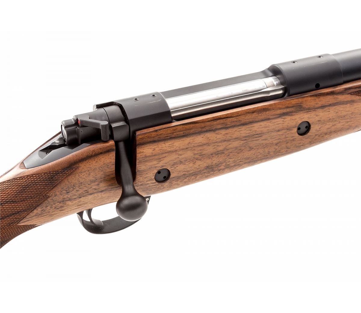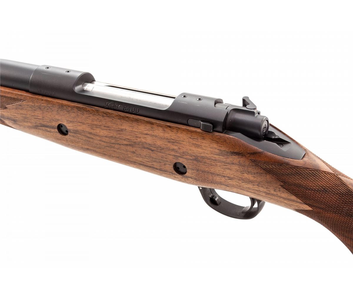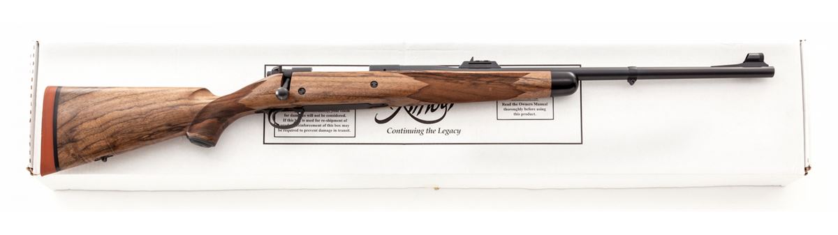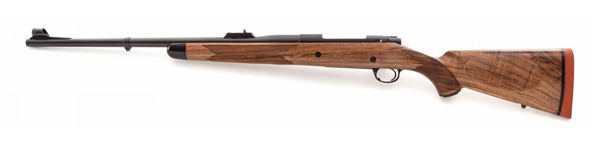 Kimber Model 8400 Caprivi Bolt Action Rifle, #KW16083, .458 Lott cal., 24'' barrel, matte finish, finely checkered circasian walnut stock, with three-leaf Express rear sight and simulated ivory bead front. Condition is excellent showing little use, with evidence of scope mount to top of receiver and very light marks from handling to stock. All nicely packed in its original box and shipping sleeve. Est.: $2,000-$2,500. (Modern)