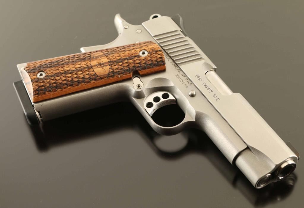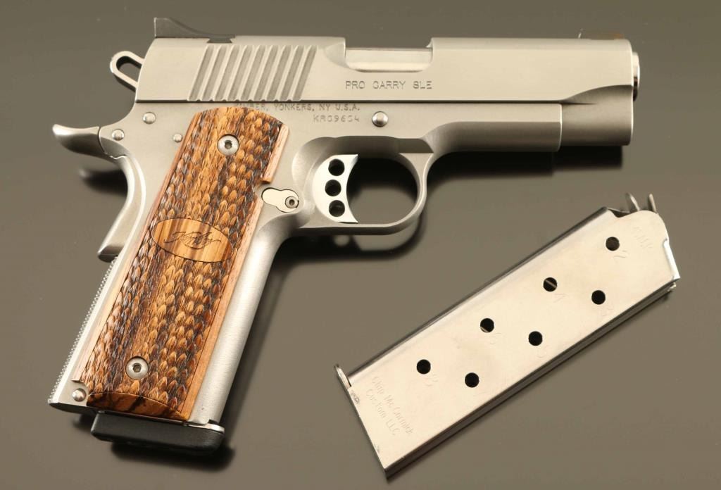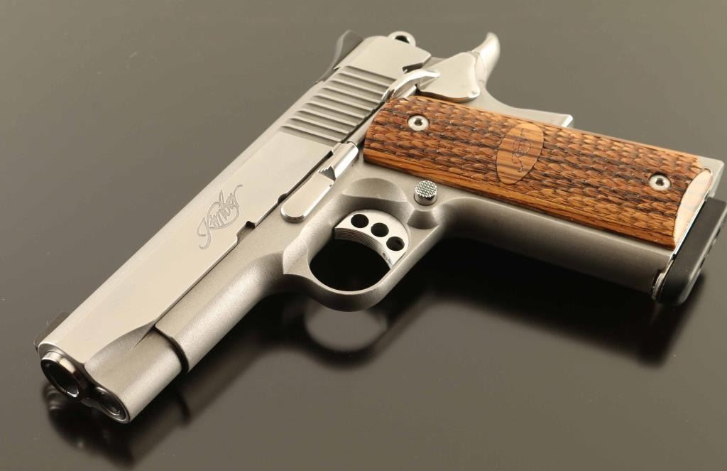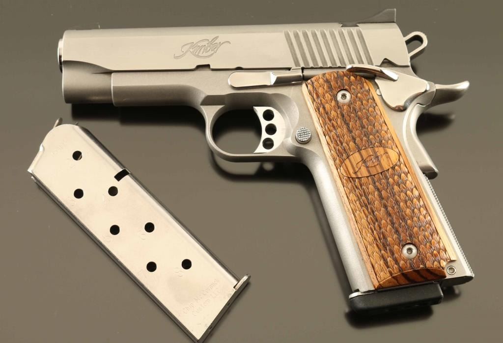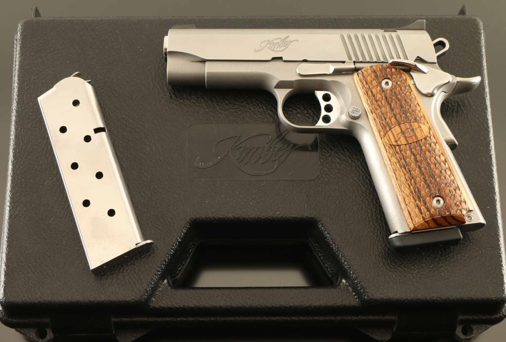 'Stainless Limited Edition' Premium quality stainless steel 1911-A1 style single action semi-automatic compact pistol chambered in .45 Auto. One of only 1,329 produced. Features a matte finish with polished accents, bushingless 4" match grade barrel, full length steel guide rod, dovetailed three-dot sights with drift adjustable rear sight, skeletonized hammer, serrated three hole trigger with overtravel adjustment, thumb safety on the left side of the frame, upswept grip safety, stainless steel frame, knurled flat mainspring housing, push button magazine release, 8 round magazine with factory bumper, beveled magazine well and two-piece zebrawood grips with scale pattern texturing & laser cut Kimber insignias. Includes the original factory hard case with documents and a spare 8 round Chip Mc Cormick magazine. Pistol exhibits few bright scuffs & some light edge wear on the rear sight with no major wear observed. Action is smooth, the bore is excellent and the wood grips are fine. Condition is NRA Excellent in case. ***Modern Firearm***