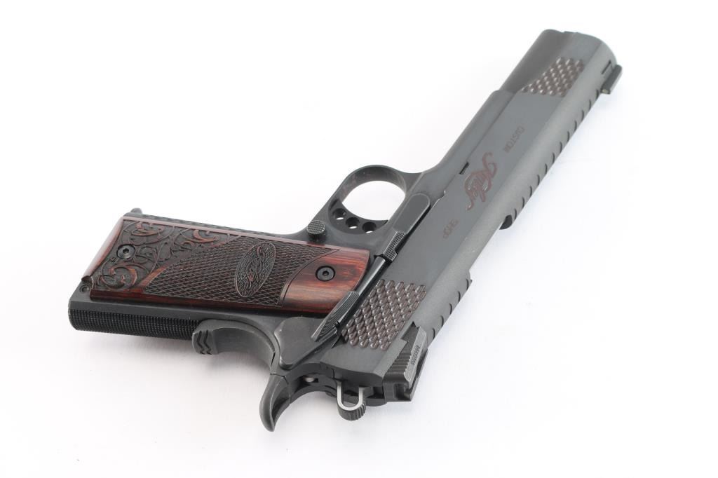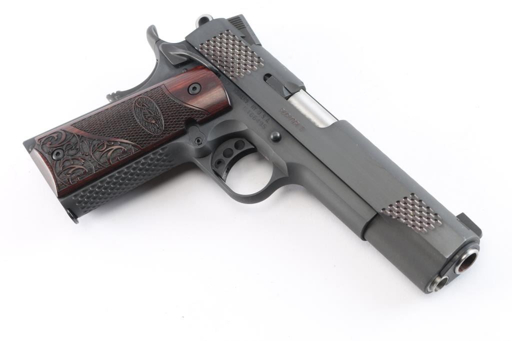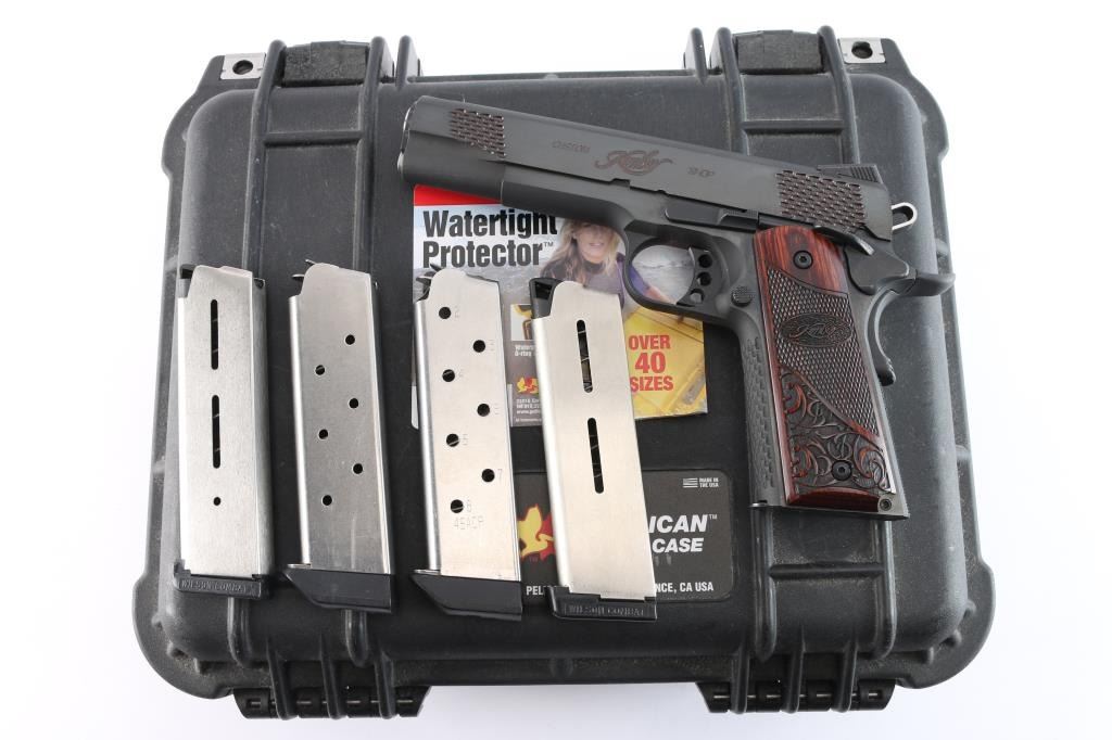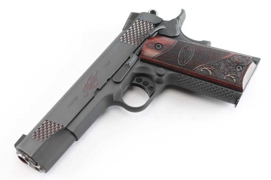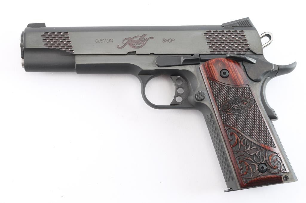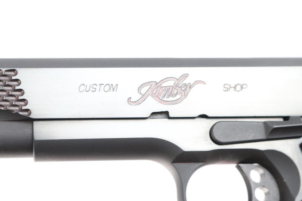 American made premium quality 1911-A1 style single action semi-automatic pistol chambered in .45 ACP. Features a matte black finish, 5" match grade barrel, full length steel guide rod, dovetailed Novak style three-dot night sights, scale-like cocking serrations, two-toned skeletonized hammer with in-the-white sides, serrated hammer spur, serrated curved skeletonized match grade trigger with overtravel adjustment, serrated extended frame-mounted ambidextrous manual safety, full-length metal guide rod, hollow recoil spring plug, extended beavertail grip safety with a grooved memory bump, series 80 type firing pin safety, checkered flat mainspring housing, scale textured front strap, checkered push-button magazine release, beveled magazine well, and two-piece laser cut scroll and checkered hardwood grips with Kimber insignias. Pistol exhibits approximately 98% of it's original finish showing a few light scattered scratches. The metal shows no rust or deformation, but the bore appears a copper color. A swab was ran through the bore and the coloring does not appear to be rust. The bore is bright with strong rifling, and the grips are excellent. Action is smooth and crisp. The night sights have dimmed. Pistol includes Pelican 1400 hard case, five total magazines, and some tools for the tritium night sights.