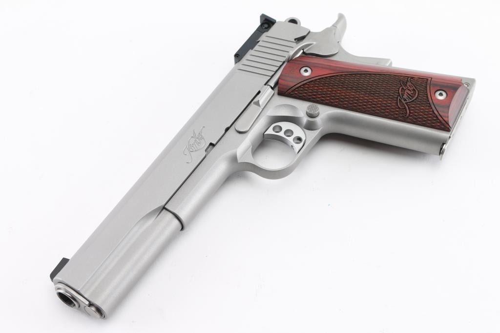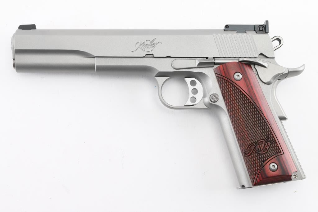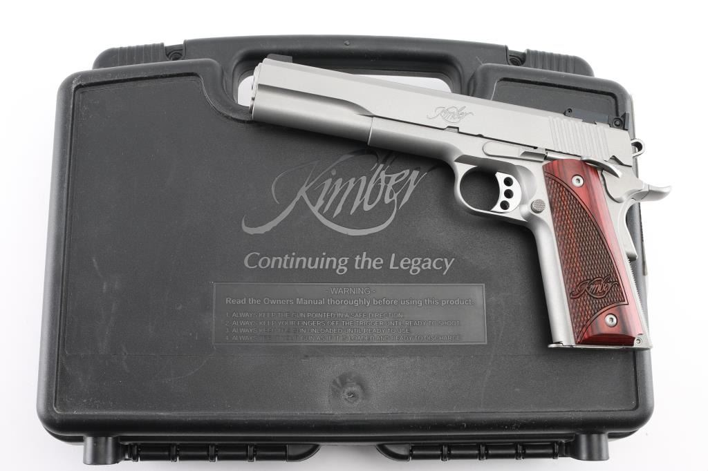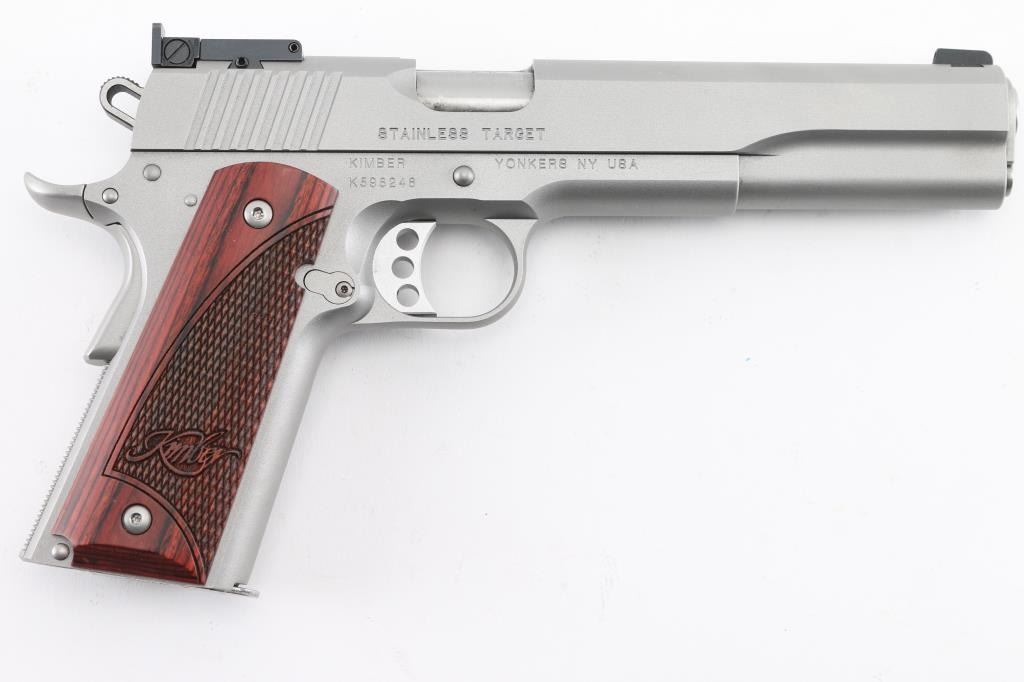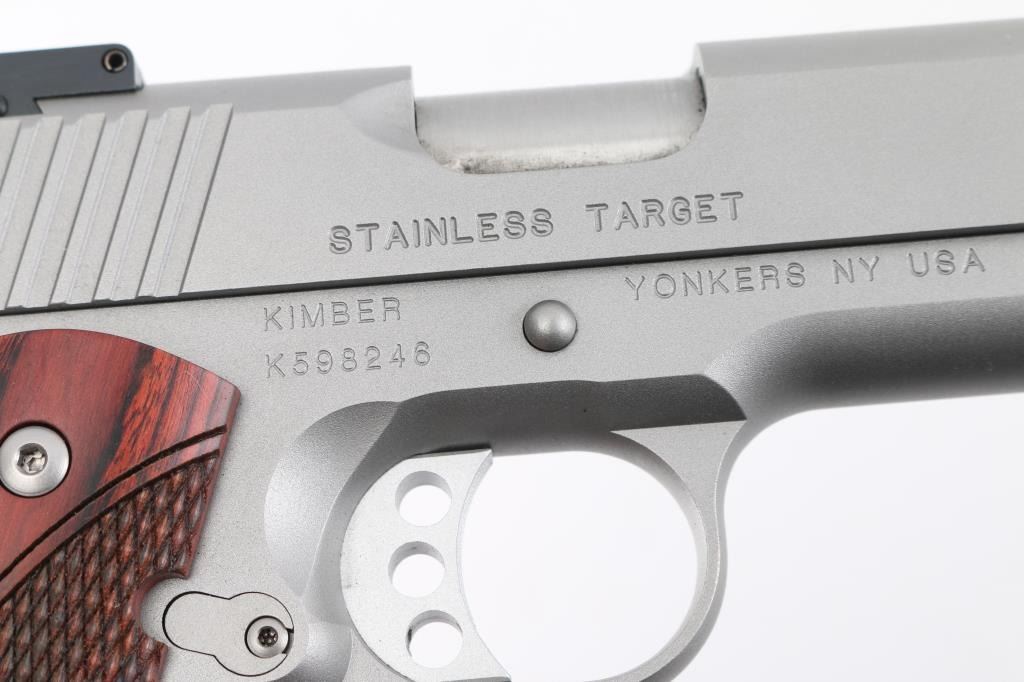 SN: K598246. High quality stainless steel 1911A1 platform single action semi-automatic target pistol chambered in .45 Auto. Features a stainless matte finish, 6" match grade barrel, dovetailed serrated blade front sight, dovetailed adjustable rear sight, serrated three hole trigger with overtravel adjustment, skeletonized hammer, extended thumb safety on the left side of the frame, upswept beavertail grip safety, push button magazine release, stainless steel frame with beveled magazine well, knurled flat mainspring housing and two-piece checkered wood grips. Bore is excellent condition. External appearance is excellent , like new condition. Includes (1) Kimber magazine, black plastic Kimber box, paperwork, lock. Condition is NRA Excellent. Modern Firearm.