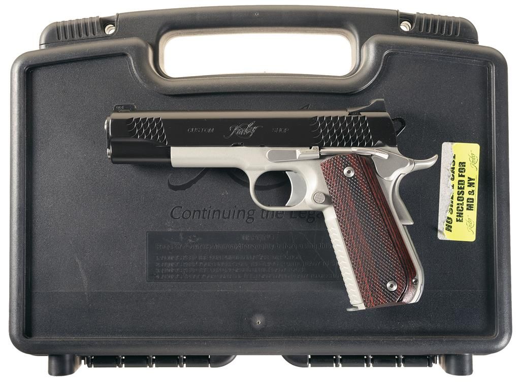 Fixed Tritium night sights with cocking shoulder, extended ambidextrous thumb safety, beavertail grip safety, super carry serrations, high cut under trigger guard, rounded mainspring housing and frame, aluminum frame, flat top slide with fish scale serrations, checkered slide stop, fish scale serration on front strap, match grade solid aluminum trigger, skeletonized hammer. Case is not numbers matching but does come with one magazine with slam pad.