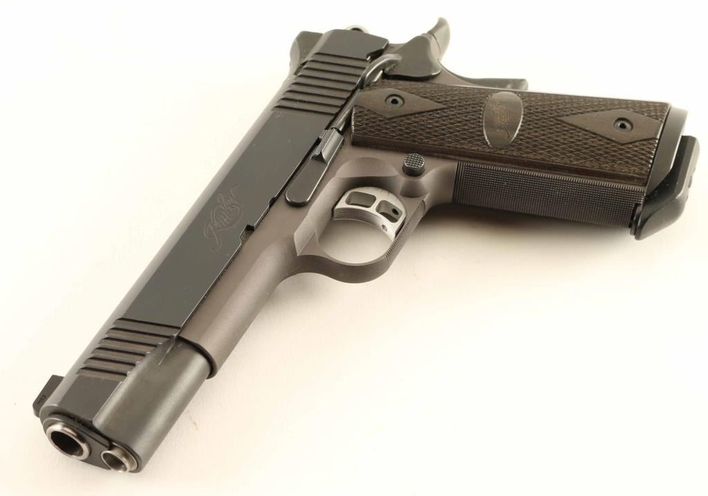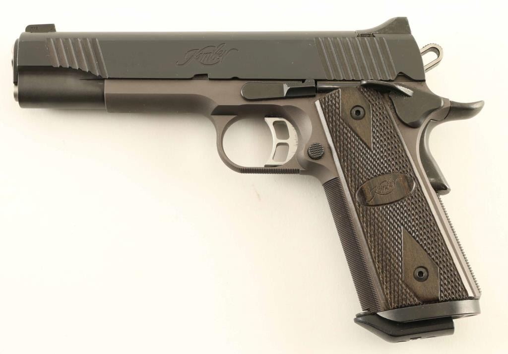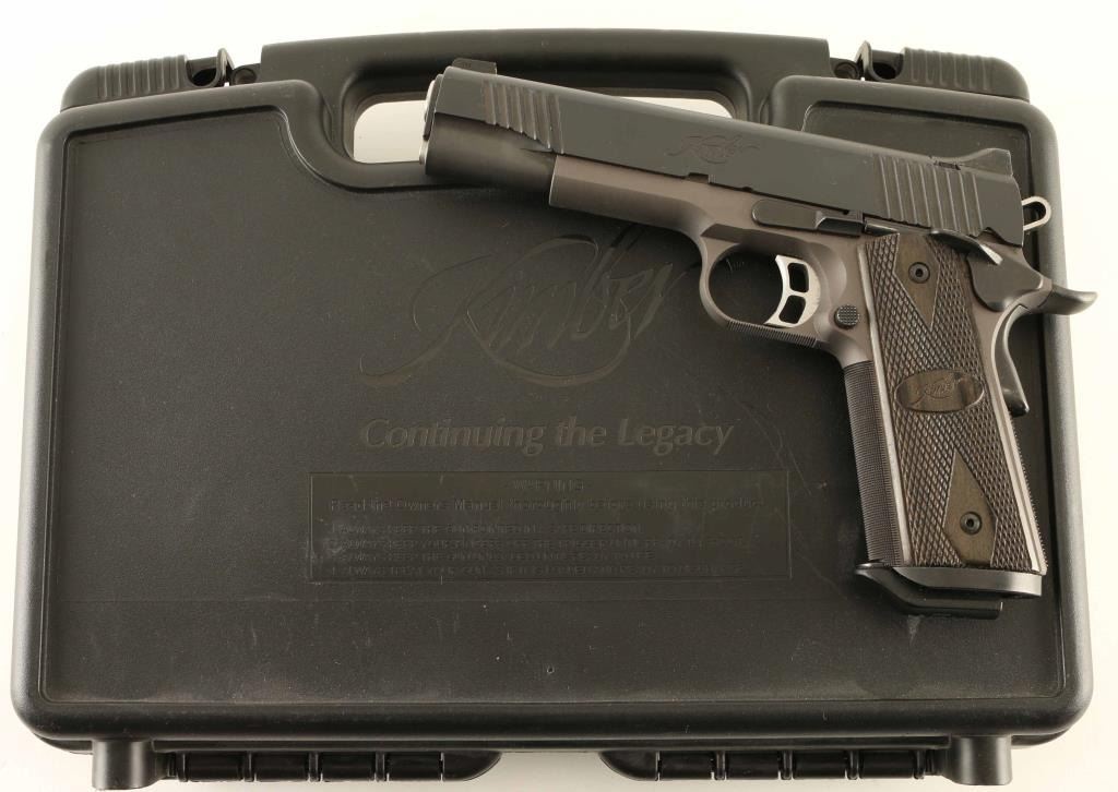 Semiautomatic pistol chambered for 45acp. Features two tone finish (dark gray slide and controls over medium gray frame), 5" barrel, extended ambidextrous manual safety, beavertail grip safety, adjustable overstop trigger, flat checkered mainspring housing, checkered front strap and bottom of trigger guard, full length recoil spring guide, wide magazine well funnel, dovetail mounted 3 dot night sights, double diamond checkered Kimber logo grips. Bore is in excellent condition. Finish is very good or better with some rub marks on top of slide, scratch marks on right side of frame, and bare metal visible on rear sight. Includes on magazine, cable lock, manual, factory plastic carry case. Condition is NRA Very Good to Excellent ***Modern Firearm***
