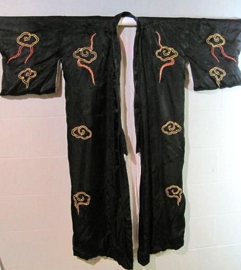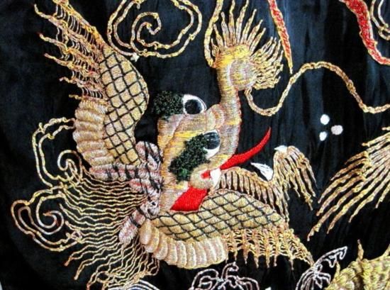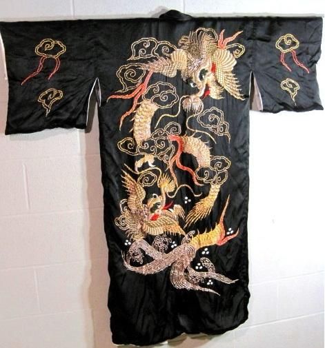 Kimono WW 11 Soldier Souvenir Extra High Relief Hand Embroidery. The entire piece appears to be hand sewn with hand embroidery that is stuffed and appears about 3/8 to 1/2 in. thick in the bird and dragon. The colors are still great. Some of the silver and gold threads are warn and the inner material shows through. As hung, the garment 4 ft. 1 inch across the top arms and shoulders. It measures 4 ft.2 in. in length. Each sleeve is 12 in. long at the shoulders. The collar is 1 1/2 in. tall. mwf2016