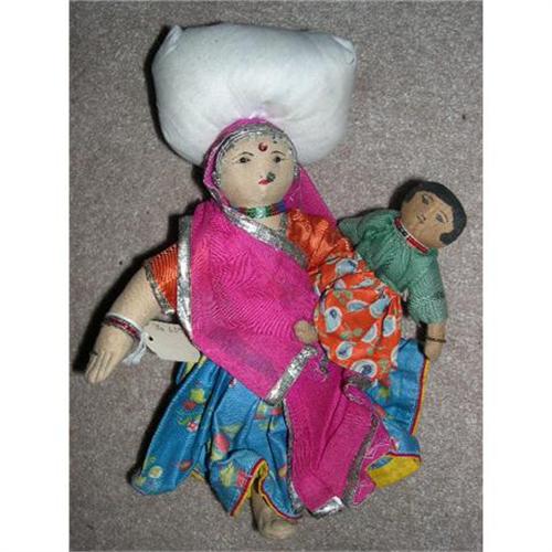 This is a great Kimport tagged doll. The doll was made in India. She represents a laundry woman and her child. She has the wash on her head and the baby in her arms. She has black beads for her eyes and more beads on he forehead and she also has a nose ring. She has jewelry on on toes, hands and several bracelets.She has bead necklaces and earings. She has one long black braid down her back which is made from the thin black string. Maybe she's just picking up the wash! The child is her arms has painted features. It is 4". She also has beads as necklaces and she has a bracelet. Her legs swing. Her colors are nice and bright. I see two brown stains on her dress in the back.I think she's adorable. She's from a smoke free environment. Buyer to pay $10 for U.S. shipping, insurance, and handling. Thanks for viewing.