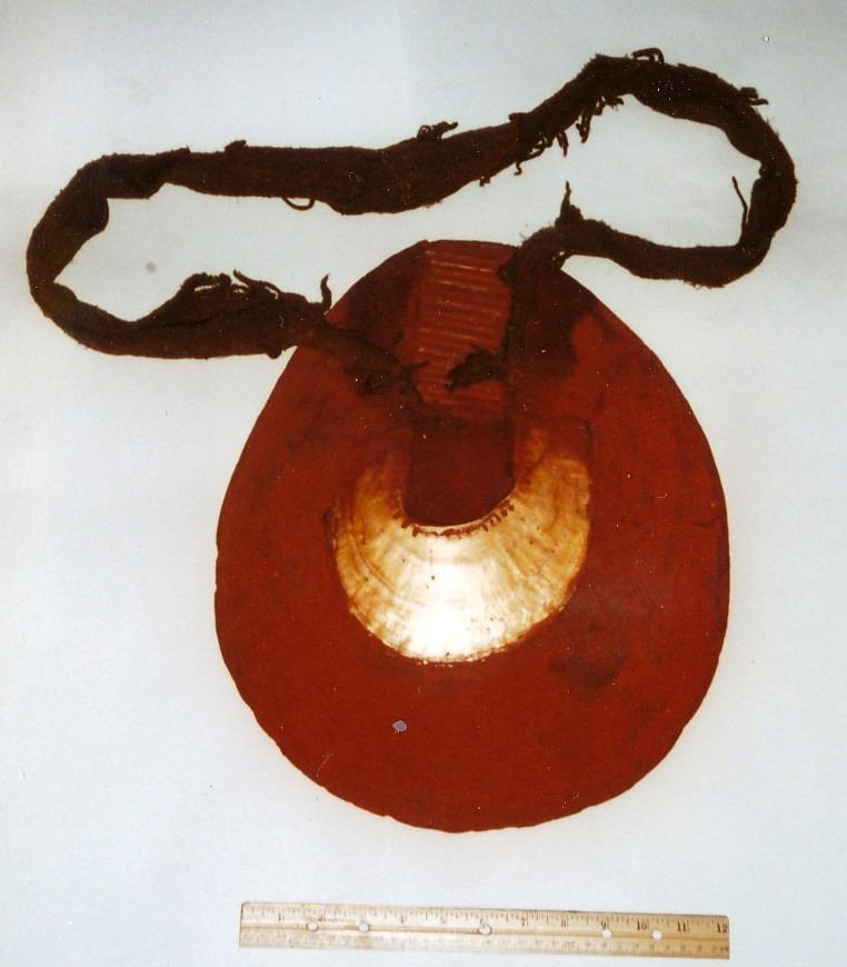 Description: Kina mokas were used as money and bride price by several tribes in a large area of the Western Highlands of Papua New Guinea; the glistening kina shell was affixed to an oval board covered with red ochre. This example illustrated in Opitz, p. 176, top.
