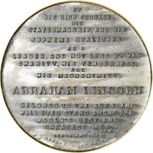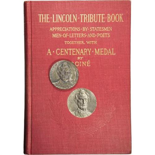 <B>King-332 1909 Lincoln Centennial Medal and Book.</B></I> Silver, 32 mm,<B> </B></I>King-332, by Jules Edouard Roine, sculptor. Obverse, full-face Lincoln. Reverse, a long quotation by HSK (Horatio Sheafe Krans), copyright 1909, struck by the Medallic Arts Co. of New York. The medal is bound in a copy of <I>The Lincoln Tribute Book,</B></I> edited by Krans, published by G. P. Putnam's Sons, New York, 1909. This is the <B>second and scarcer</B></I> of the two books of the period with medals bound in. The book has a red cloth cover and is as near to Mint State as possible. A wonderful Lincoln collectible and a great addition to one's Lincoln collection.<BR><BR><b>Shipping:</b> Coins & Currency (<a target="_blank" href="http://www.heritageauctions.com/common/shipping.php">view shipping information</a>)
