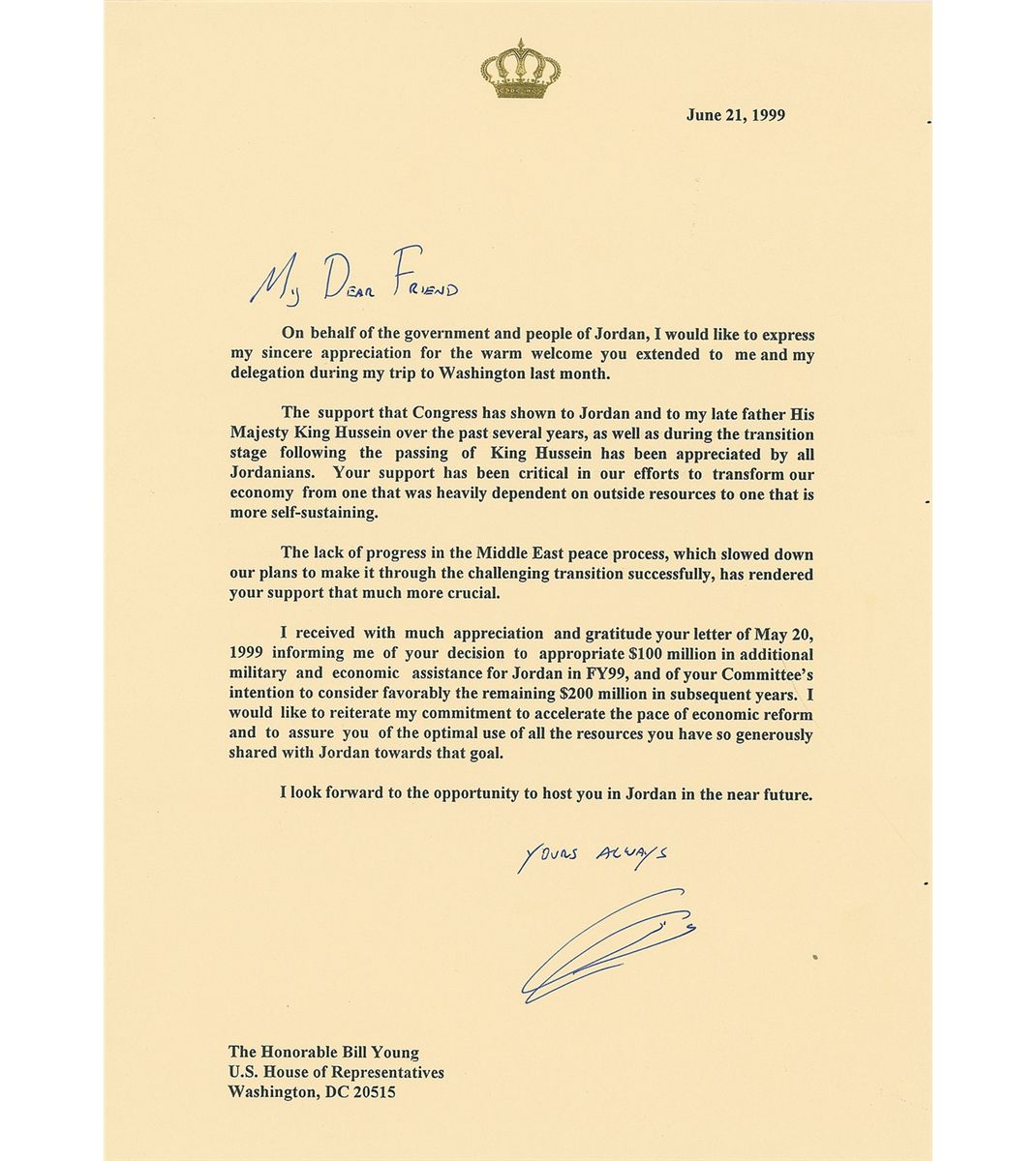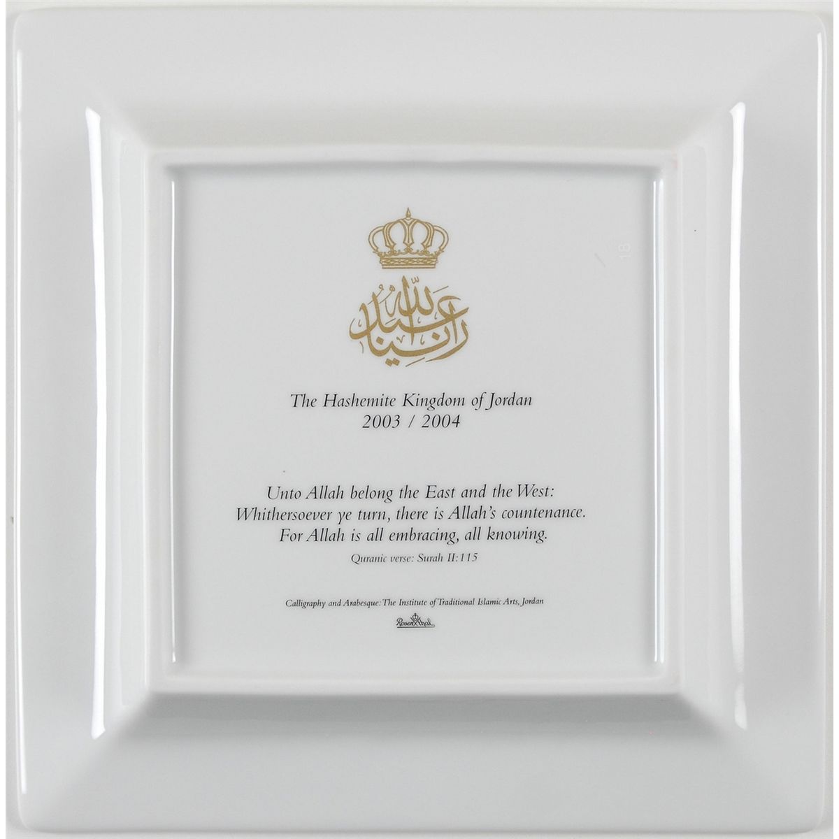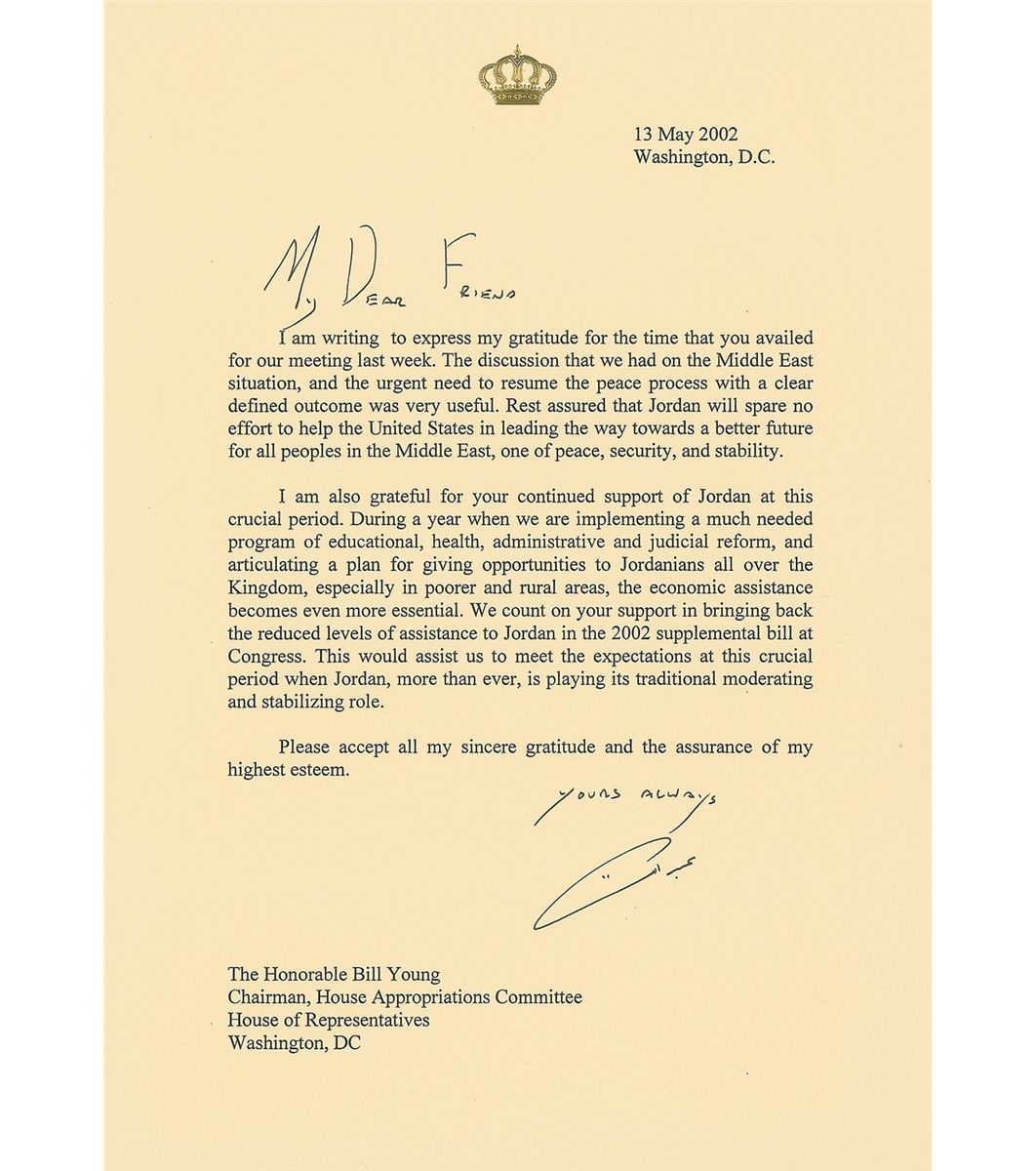 Three items: a square white porcelain plate, 8.5 x 8.5, given to Congressman Charles William Young as a gift from King Abdullah II of Jordan. The plate features an intricate gold and blue design on the borders and an Arabic verse from the Quran in the center. The underside features the royal cypher, lettered “The Hashemite Kingdom of Jordan, 2003/2004,” and an English translation of the verse on the front: “Unto Allah belong the East and the West: / Withersoever ye turn, there is Allah’s countenance. / For Allah is all embracing, all knowing.” Also bears the Rosenthal manufacturer’s logo, reading: “Calligraphy and Arabesque: The Institute of Traditional Islamic Arts, Jordan.” Includes the original gilt-stamped presentation box and a hard wooden case. Also includes two TLSs signed by King Abdullah II, each one page, 8.25 x 11.5, embossed royal letterhead, dated 1999 and 2002. The first, in part: “The support that Congress has shown to Jordan and to my late father His Majesty King Hussein over the past several years, as well as during the transition stage following the passing of King Hussein had been appreciated by all Jordanians…the lack of progress in the Middle East peace process, which slowed down our plans to make it through the challenging transition successfully, has rendered your support more crucial.” The second, in part: “The discussion that we had on the Middle East situation, and the urgent need to resume the peace process with a clear defined outcome was very useful. Rest assured that Jordan will spare no effort to help the United States in leading the way towards a better future for all peoples in the Middle East, one of peace, security, and stability.” In overall fine to very fine condition. Accompanied by two transmittal envelopes. Abdullah II had ascended to the Jordanian throne in early 1999 following the death of his father, who had maintained close bilateral relations with the United States throughout his entire reign and made Jordan one of America’s most stable allies in the Middle East. While the first letter comes shortly after Abdullah’s reign began, the second discusses the “Middle East situation,” alluding to the increasing tension in the aftermath of the September 11th attacks—less than a year later, the American invasion of Iraq would begin.