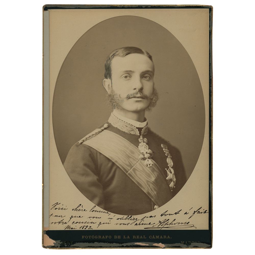 King of Spain (1857–1885) who reigned from 1874 to 1885, after a coup d'etat restored the monarchy and ended the ephemeral First Spanish Republic; his mother, Isabella II, had been deposed in the Glorious Revolution of 1868. Large and uncommon 6.75 x 9.75 mounted albumen photo of King Alfonso in his decorated uniform, signed and inscribed in French in ink to his dear cousin, and dated May 1882. In very good to fine condition, with a thin cardboard strip affixed along the left edge, some surface loss to the bottom border, and mounting remnants to reverse.
