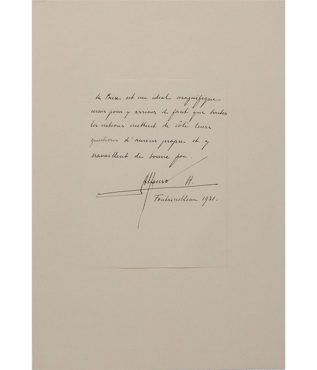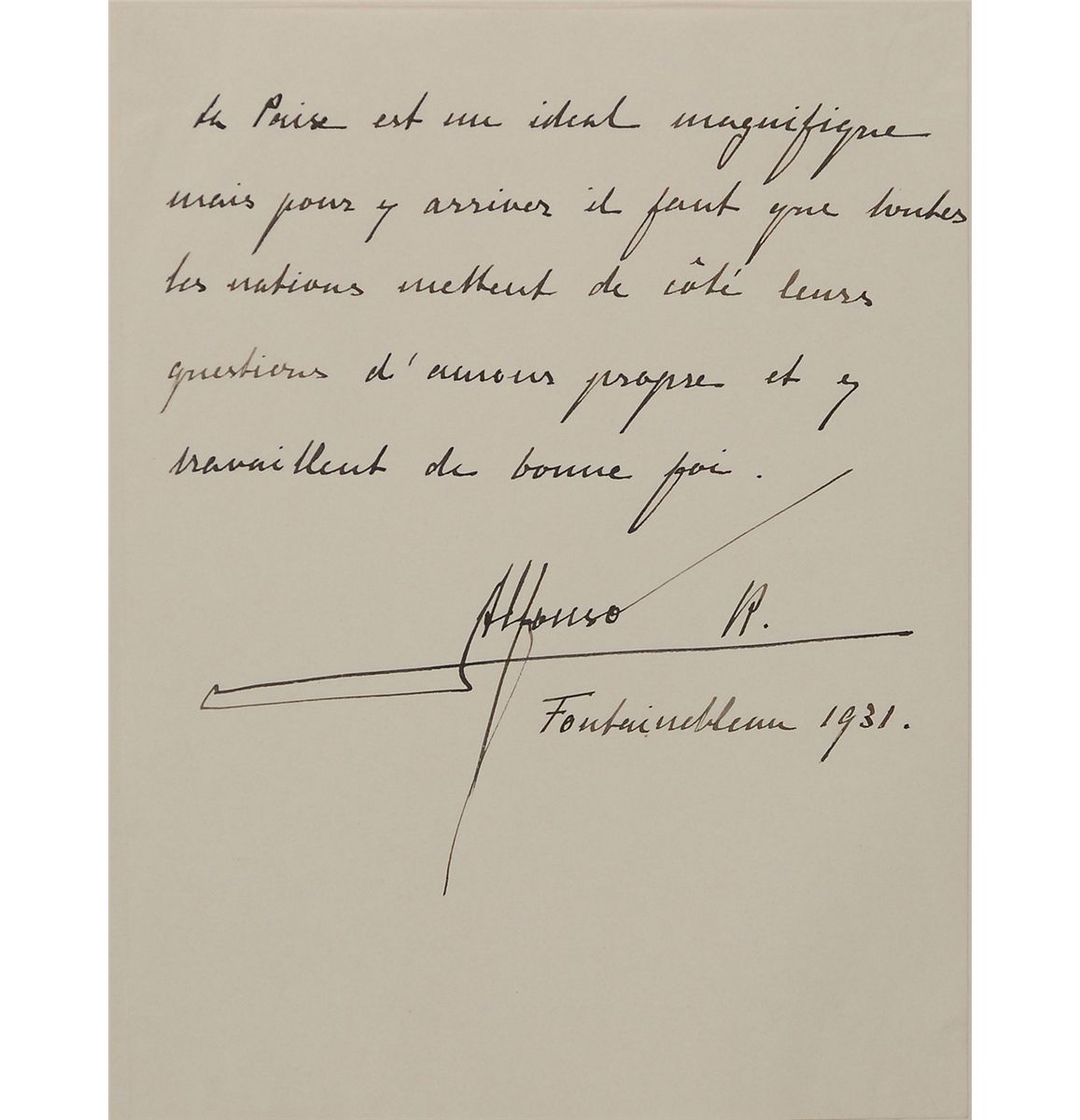 King of Spain from 1886 until 1931, who was proclaimed king at birth and assumed leadership at just 16 years old (1886–1941). AQS, in French, signed “Alphonso R.,” one page, 6.25 x 8.25. Dated “Fontainebleu, 1931. Alfonso writes, in full (translated): “Peace is a magnificent ideal, but in order to achieve it, all nations must set aside their questions of pride and work for it in good faith.” Page is affixed by its corners to an 11.25 x 16.5 off-white sheet. In fine condition.