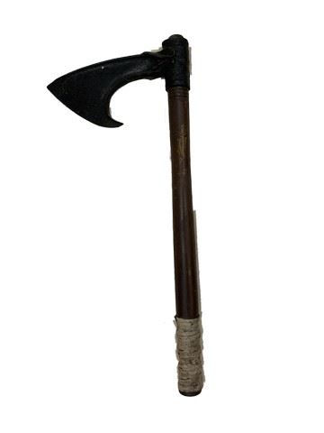 King Arthur - Screen used Woad Warrior axe made of hard rubber with painted brown handle with white wrapped grip and rustic looking black axe head. There are dried up blood stains and some tears in the front of the head from actual use during production (24" x8").