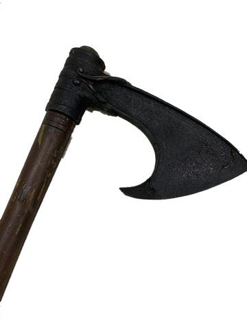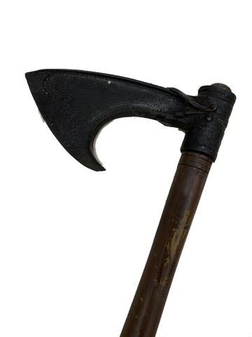 King Arthur - Screen used Woad Warrior axe made of hard rubber with painted brown handle with white wrapped grip and rustic looking black axe head. There are dried up blood stains and some tears in the front of the head from actual use during production (24" x8").
