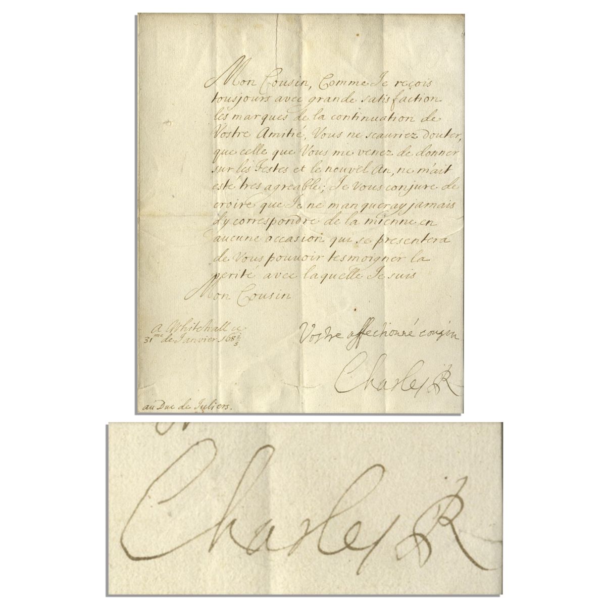 Charles II letter signed, ''Charles R'' as King of England and Ireland. Letter is dated 31 January 1683. French language letter is addressed to Charles's cousin, the Duc de Juliers, and inscribed in Charles' hand in French, ''Your affectionate cousin''. Single-page letter on card-style stationery measures 5.75'' x 7.25''. Addressed between two red wax seals. Toning and folds, with a small closed tear near but not affecting the ''C'' in Charles, else near fine.