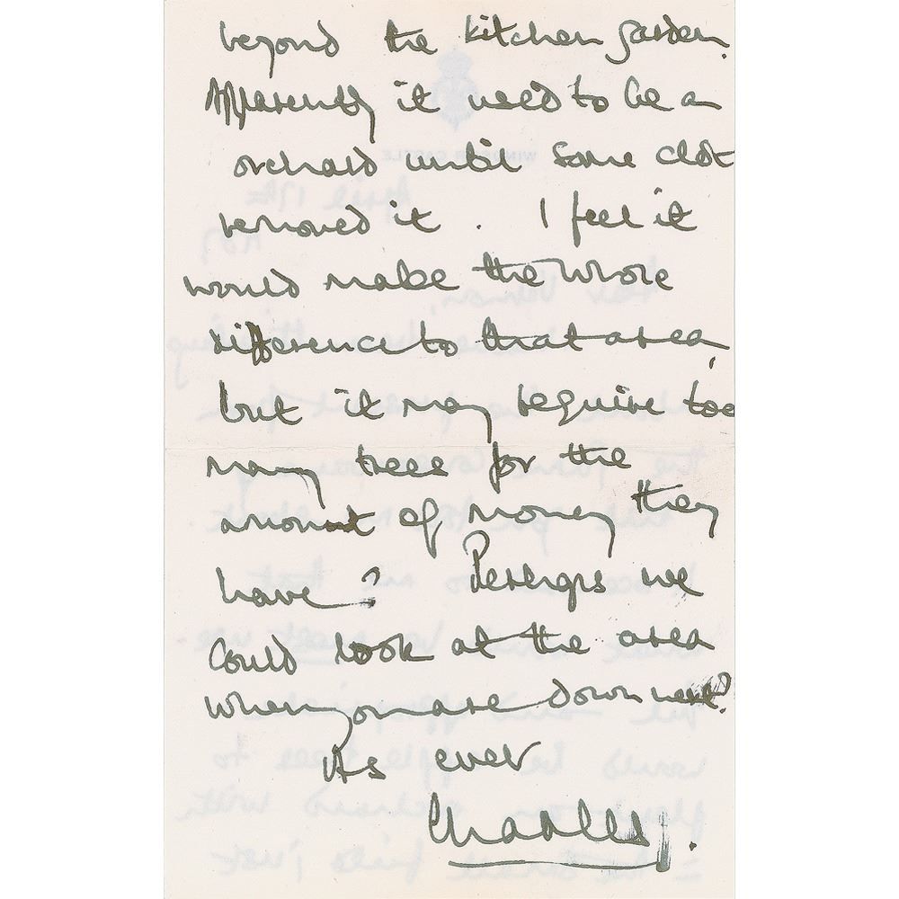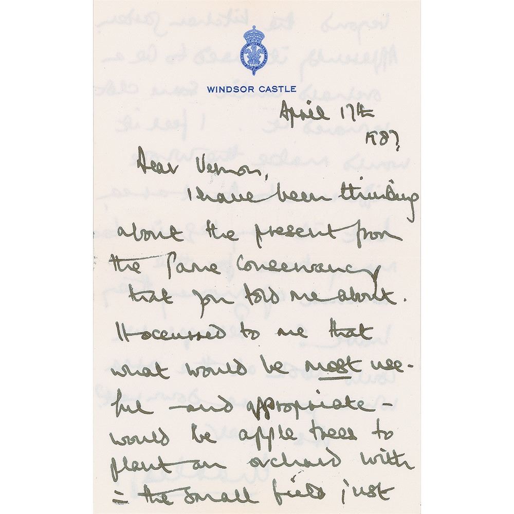 ALS signed “Charles,” one page both sides, 4.75 x 7.5, Windsor Castle letterhead, April 17, 1987. Letter to friend and landscape consultant Vernon Russell-Smith, in part: "I have been thinking about the present from the Game Conservancy that you told me about. It occurred to me that what would be most useful—and appropriate—would be apple trees to plant an orchard with the small field just beyond the kitchen garden. Apparently it used to be an orchard until some clot removed it. I feel it would make the whole difference…but it may require too many trees for the amount of money they have? Perhaps we could look at the area where you are down next?" In fine condition. Accompanied by the original mailing envelope, addressed in his own hand.