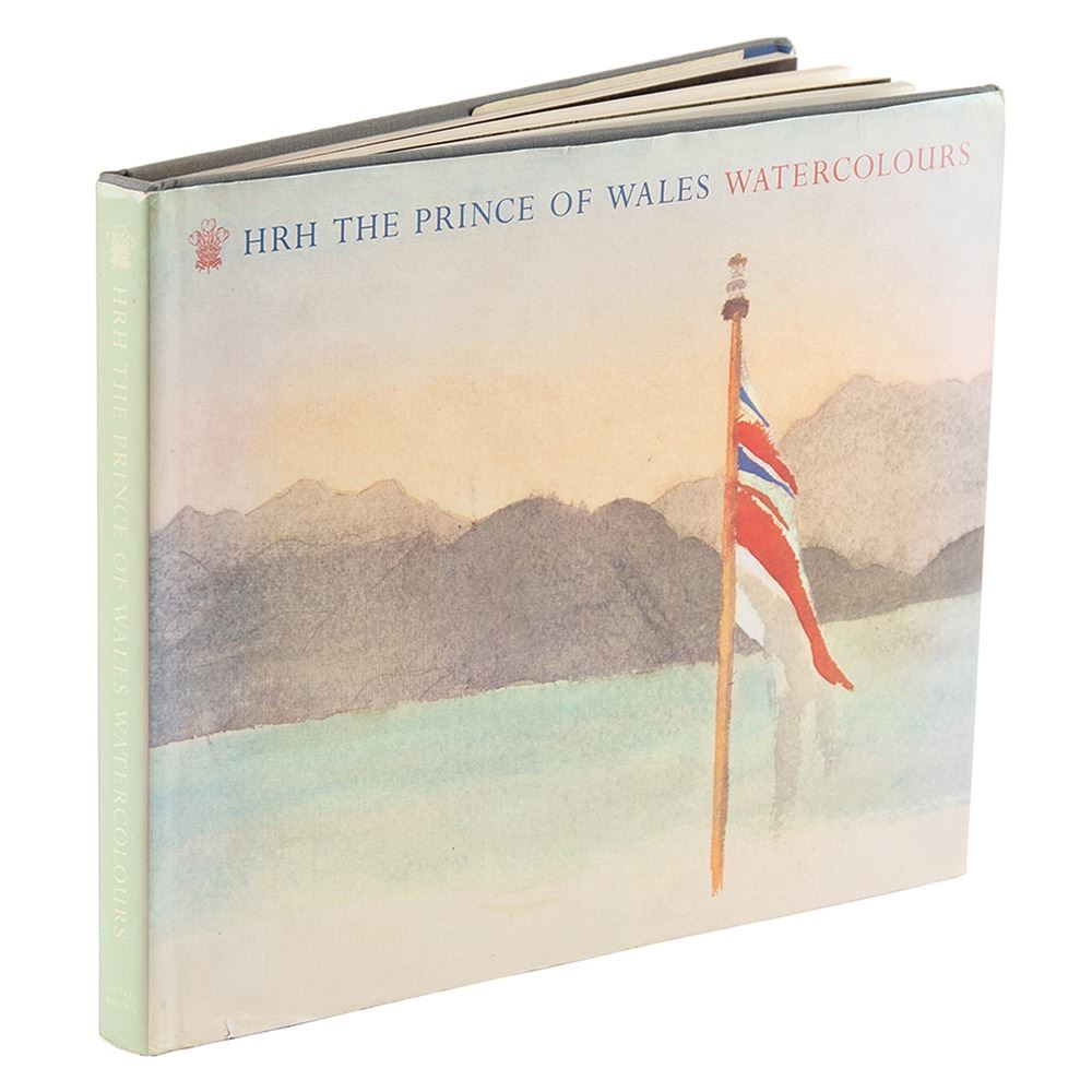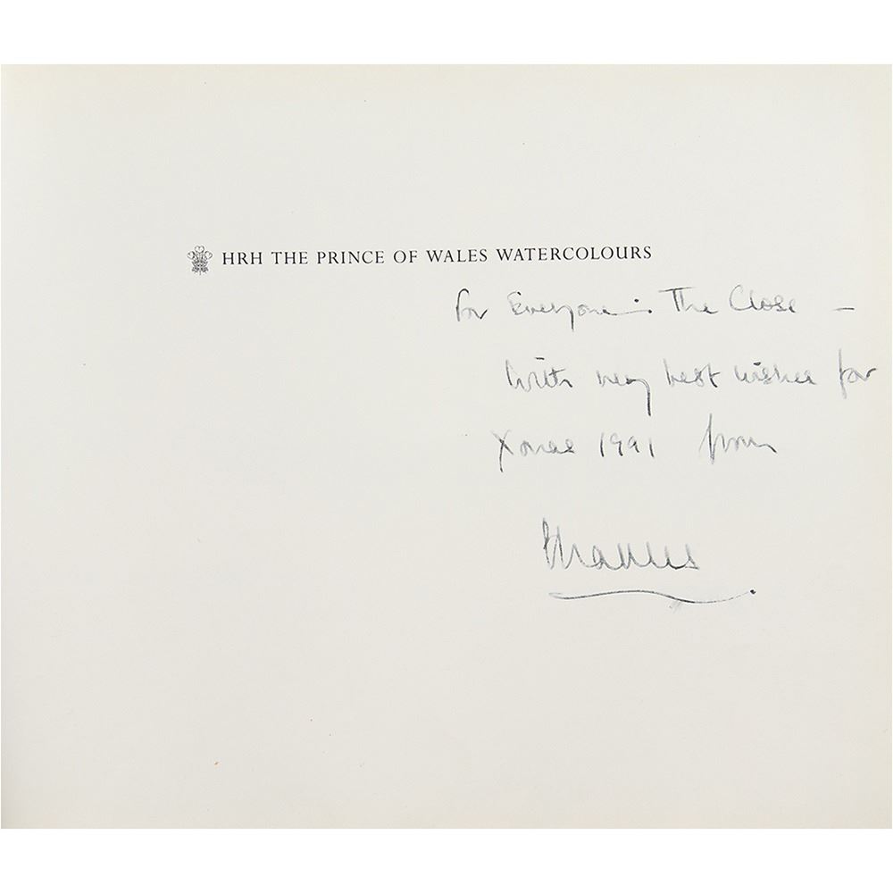 Signed book: HRH The Prince of Wales Watercolors. First edition. NY: Little, Brown and Company, 1991. Hardcover with dust jacket, 11.25 x 9.5, 159 pages. Signed and inscribed on the half-title page in ink, "For Everyone in The Close"”With very best wishes for Xmas 1991, from Charles." In fine condition, with some minor bowing to the pages, edgewear to the dust jacket, and some irregular ink adhesion.
