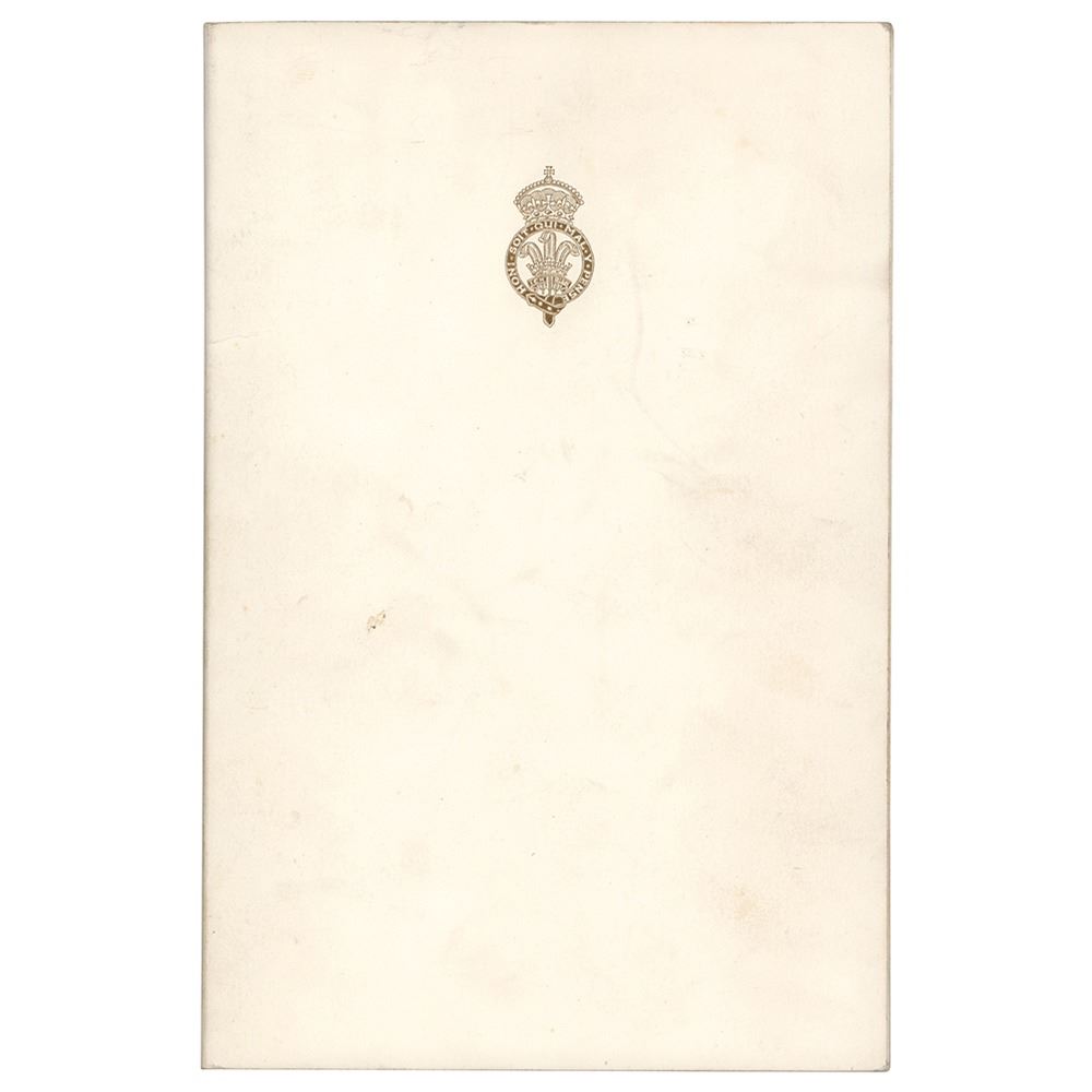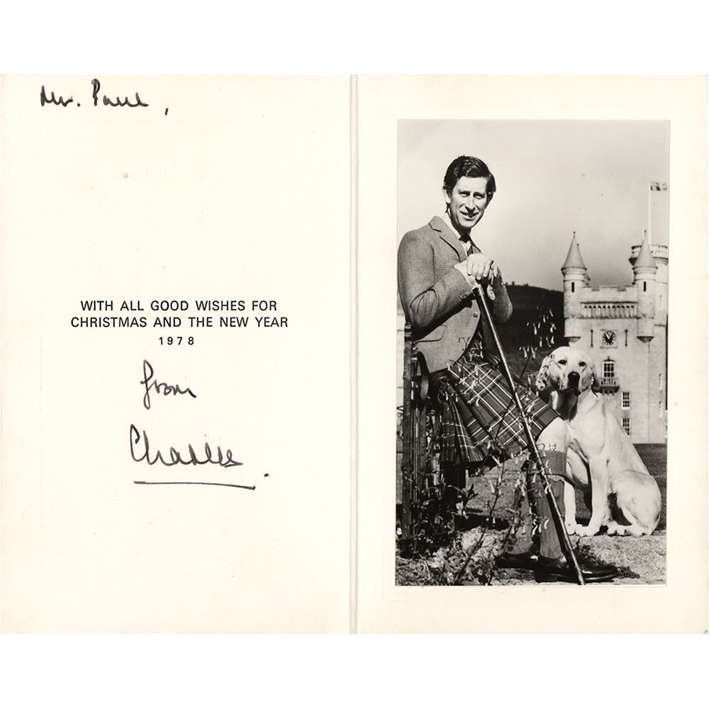 Christmas card from 1978 with the front bearing an embossed coat of arms, measuring 9.5 x 7.25 open, featuring an affixed photo inside of Charles wearing a kilt on the grounds of Balmoral Castle and seated with his faithful Labrador, Harvey, signed and inscribed on the left side in fountain pen, "Mr. Paul, from Charles." In fine condition, with light soiling to the outside covers.