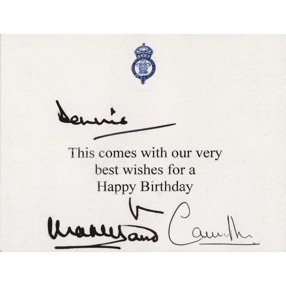 Appealing official 4.75 x 3.75 birthday card featuring an embossed coat of arms and printed birthday wish, signed and inscribed in black ink, "Dennis, from Charles and," and, "Camilla." In very fine condition.