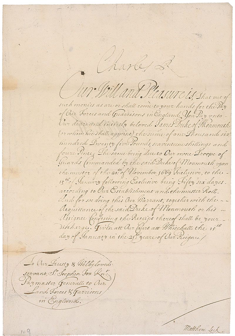 British monarch (1630–1685) who ushered in the Restoration of 1660 and ruled until his death. Uncommon manuscript DS, signed “Charles R,” one page, 8 x 11.75, January 15, 1670. King Charles orders a payment to James, Duke of Monmouth, of “one Thousand six hundred Twenty five Pounds, seaventeene shillings and foure Pence, the same being due to Our owne Troope of Guards Commanded by the said Duke of Monmouth upon the muster of the 20th of November 1669.” Signed at the top by King Charles II and on the reverse by Monmouth. Three lightly toned areas of adhesive to left edge, otherwise fine condition. The eldest illegitimate son of Charles II, Monmouth famously led the unsuccessful 1685 revolt against his uncle, King James II, by which he attempted to claim the throne for himself; his failure resulted in his beheading shortly thereafter. Items signed by both Charles II and Monmouth are exceptionally rare.