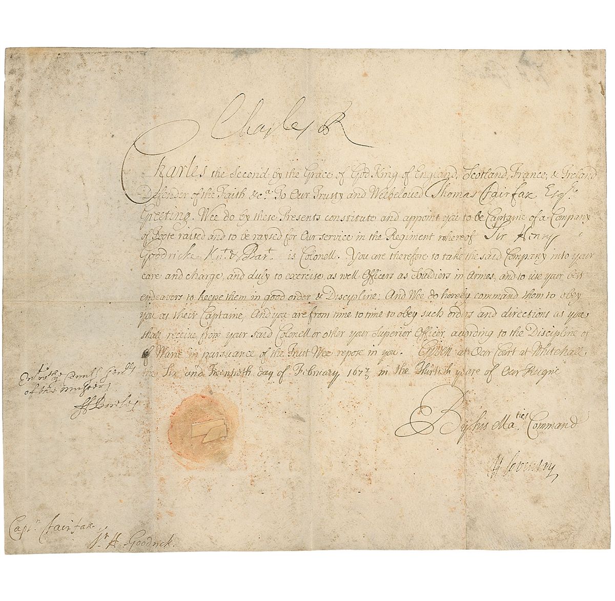 British monarch (1630–1685) who ushered in the Restoration of 1660 and ruled until his death. Vellum manuscript DS, signed “Charles R,” one page, 13.5 x 11.25, June 26, 1677/8. A military appointment issued to Thomas Fairfax, appointing him “to be Captaine of a Company of Foote raised…for our service in the Regiment whereof Sir Henry Goodricke…is Colonell.” Prominently signed at the top by King Charles II and countersigned by a government official at the bottom. Seal once affixed to lower left is absent. In very good condition, with intersecting folds (one vertical fold passing through a single letter of the signature) and moderate scattered soiling (heavier to edges). Religious strife characterized this period of Charles’s reign, primarily in the fictitious ‘Popish Plot’ concocted by by Titus Oates. He alleged that there existed an extensive Catholic conspiracy to assassinate the King Charles II, even accusing the queen of complicity. The supposed conspiracy gripped the kingdoms of England and Scotland in anti-Catholic hysteria, resulting in the executions of over 20 men and prompting the Exclusion Crisis.